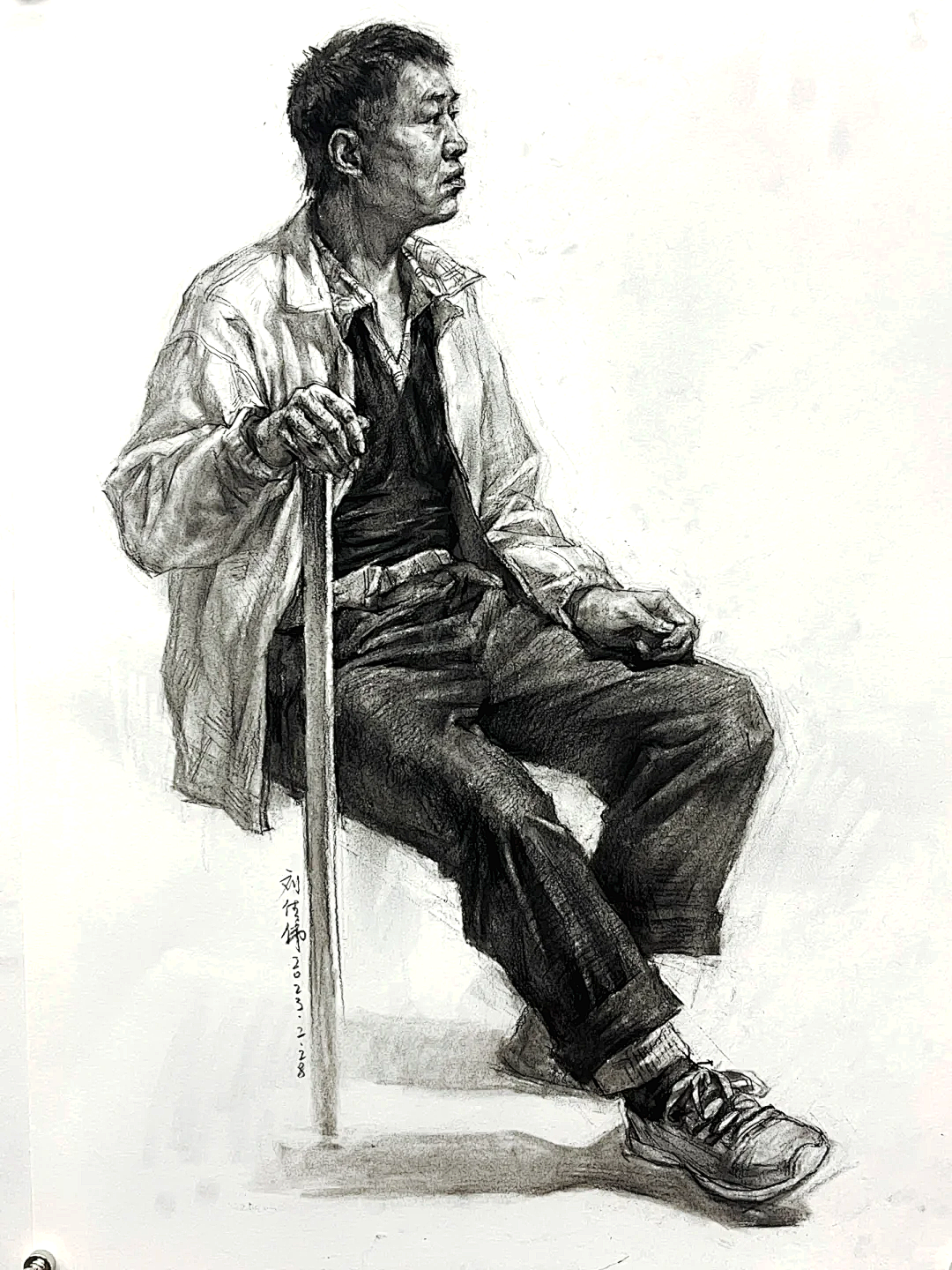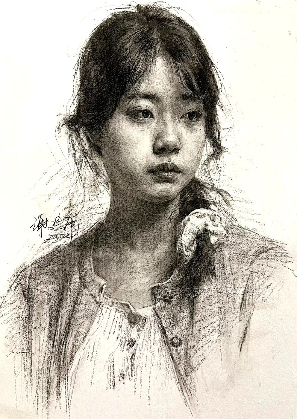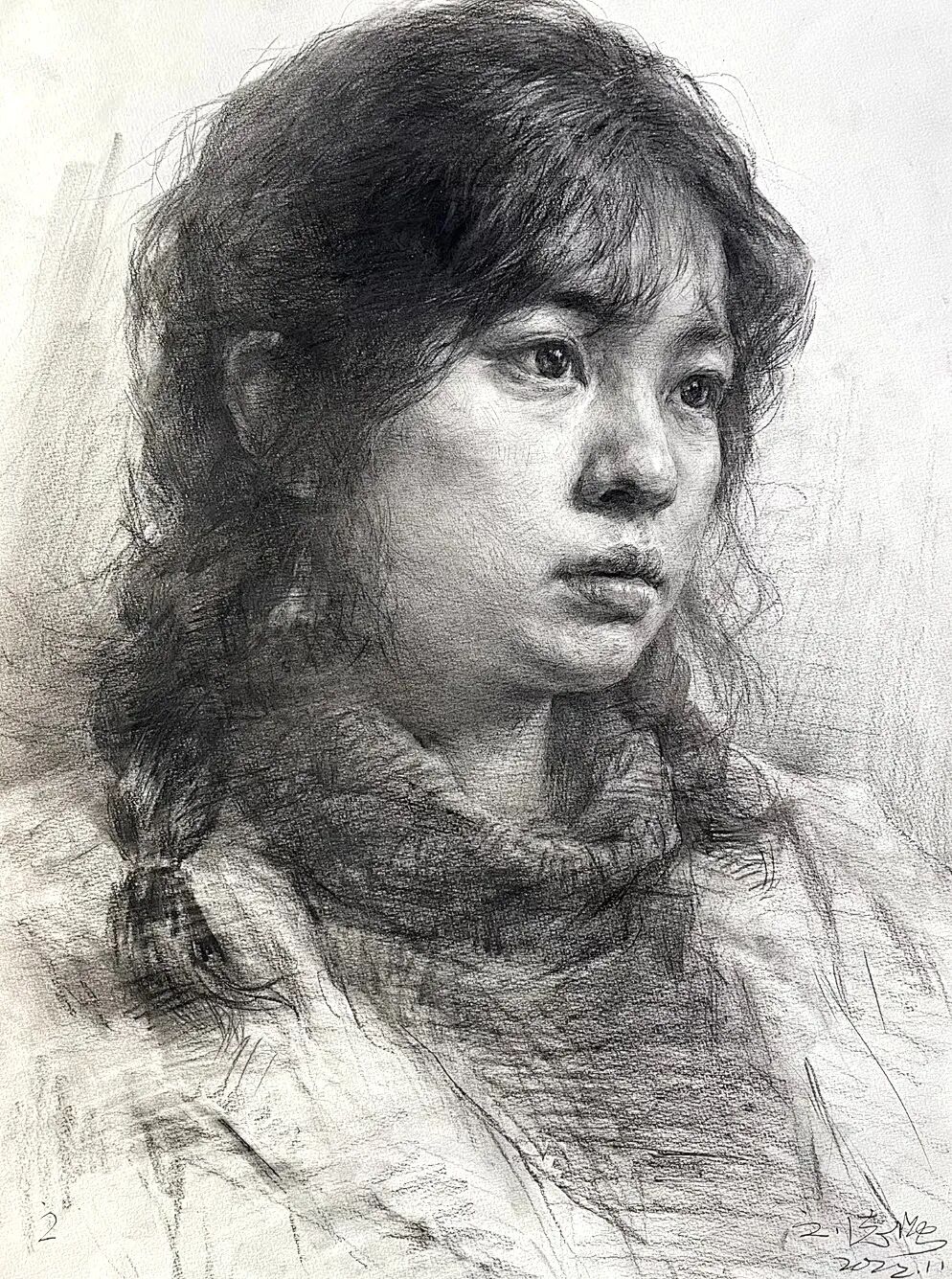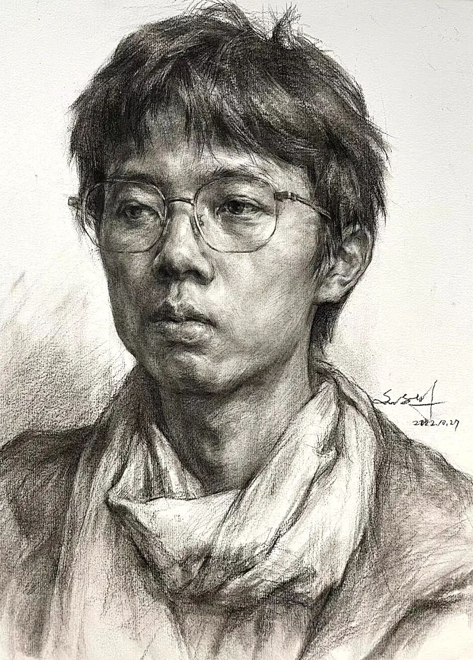# 真人头像素描 #真人头像素描是以真实的人物头部为描绘对象,通过单色线条与明暗色调,表现人物的外形特征、头部结构、神态表情、光影关系及内在气质的素描形式,是素描学习中更贴近现实、注重情感表达的阶段,也是绘画、设计等领域的重要基础。