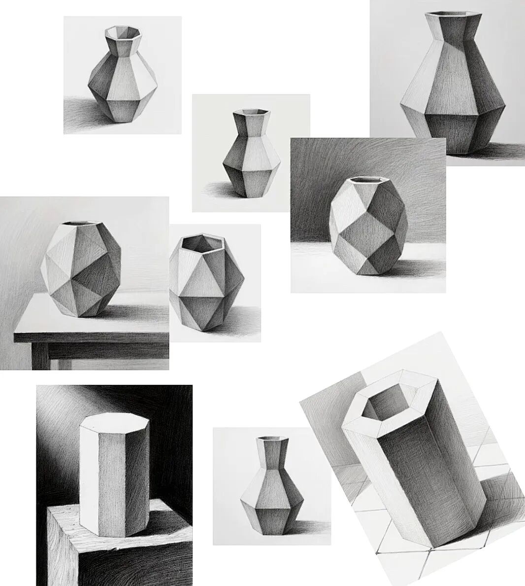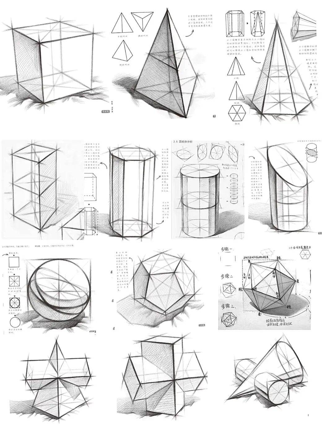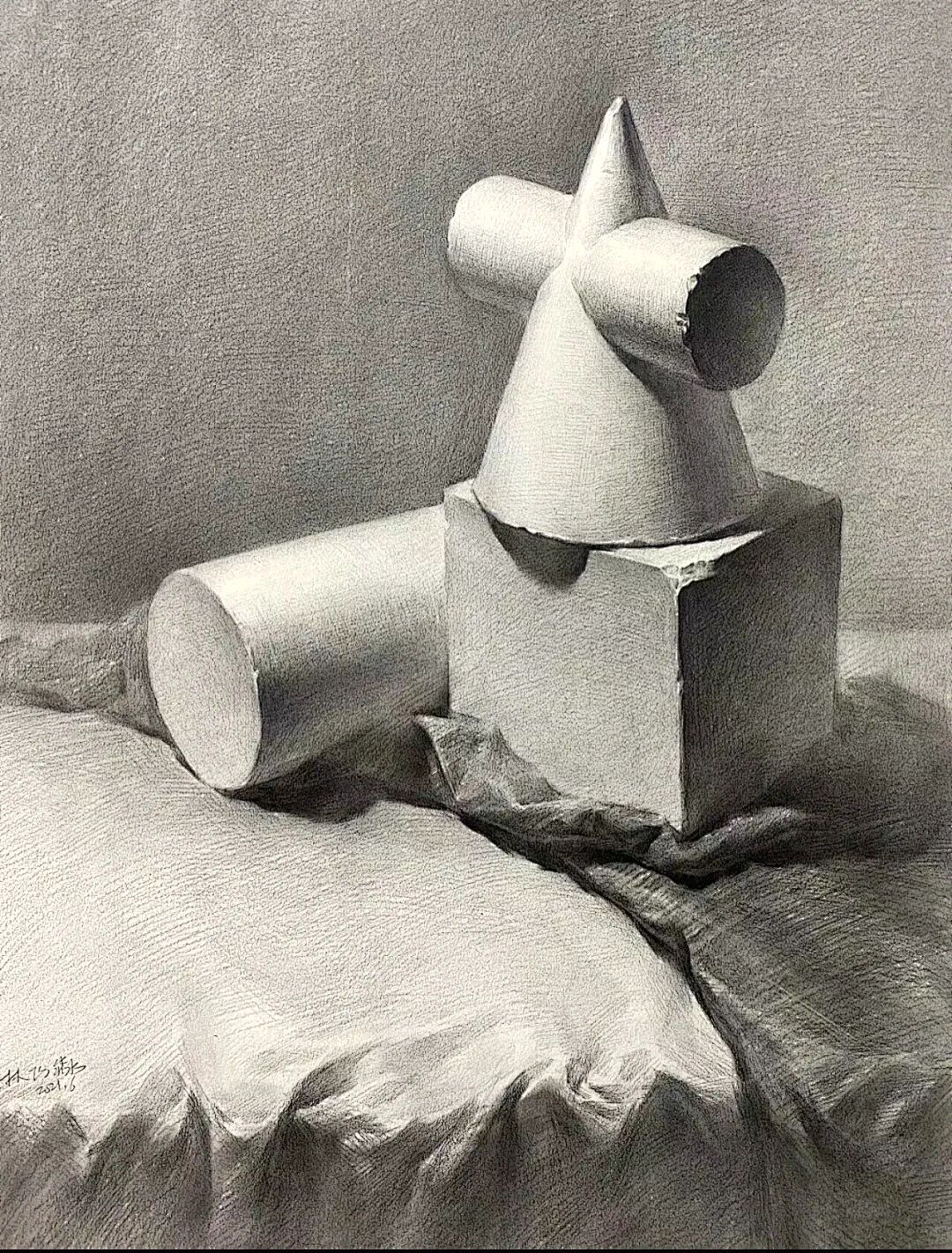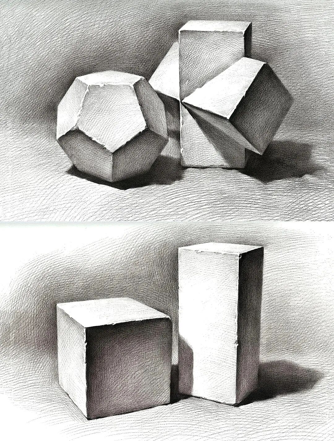 # 几何体素描 #主要描绘对象是具有基础几何形态的物体,像正方体、长方体、球体、圆柱体、圆锥体等。这些物体是对现实世界中复杂物体形态的高度概括和简化,比如生活中的苹果、橙子可以近似看作球体,建筑盒子可看作长方体,水杯类似圆柱体和圆台的组合。通过对这些基础几何体的描绘训练,能为绘制更复杂的物体打下造型基础。