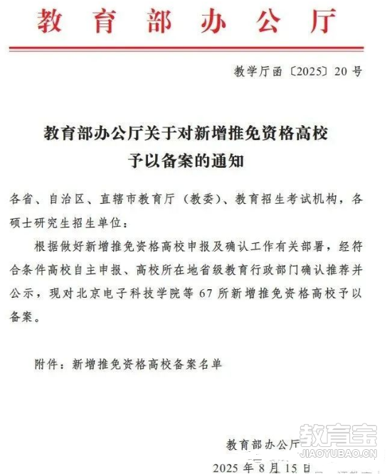 教育部公布《关于对新增推免资格高校予以备案的通知》。根据新增推免资格高校申报及确认工作的相关部署,经符合条件高校自主申报、省级教育行政部门推荐并公示,现对北京电子科技学院等67所新增推免资格高校予以备案。