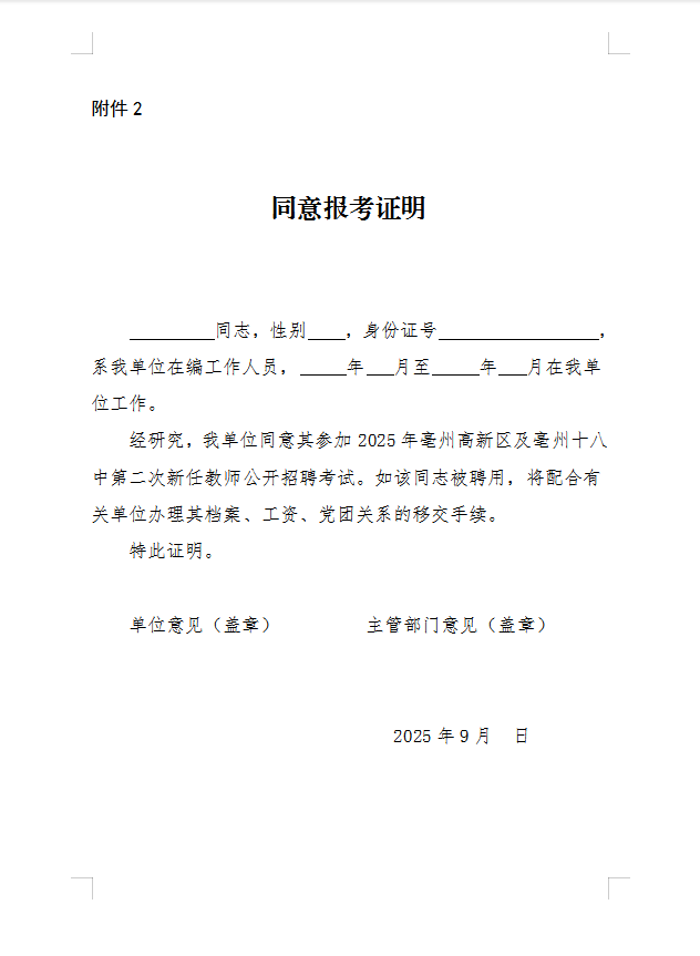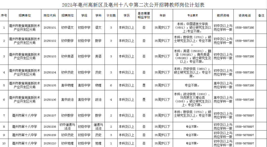 三、招聘条件(一)基本条件1.具有中华人民共和国国籍;2.热爱教育事业,遵纪守法,具有良好的品行及职业道德;3.具有相应的教师资格证书;4.身心健康,能胜任岗位工作;5.符合招聘岗位所需的其他资格条件;6.公告中涉及“年龄条件”的,如“35周岁以下”为“1989年8月28日(含)以后出生”(其他涉及年龄计算的依此类推)。退役军人年龄限制相应放宽2年。报考人员如是退役军人,请在备注栏中说明,并在附件中上传入伍通知书(或入伍批准存根复印件)、退役证明等相关材料。(二)有下列情形之一的人员,不得报考:1.不符合岗位招聘条件的人员;2.在读的全日制普通高校非2025年应届毕业生;3.现役军人;4.经政府教育部门、人力资源社会保障部门认定具有考试违纪行为且在停考期内的人员;5.曾因犯罪受过刑事处罚的人员和曾被开除公职的人员、受到党纪政纪处分期限未满或者正在接受纪律审查的人员、处于刑事处罚期间或者正在接受司法调查尚未做出结论的人员;6.按照国家、省有关规定,尚在*低服务年限内的机关、事业单位正式在编工作人员;7.法律规定不得参加报考或聘用为事业单位工作人员的其他情形人员;8.报考人员不得报考聘用后即构成《事业单位人事管理回避规定》第六条所列情形的岗位。四、招聘程序(一)发布信息《2025年亳州高新区及亳州十八中第二次公开招聘教师公告》通过亳州市人力资源和社会保障局官网、亳州市教育局官网发布。后续招聘信息将通过亳州市教育局官网(http://jyj.bozhou.gov.cn/)发布,请广大考生及时关注。(二)网上报名1.报名方式及时间。本次招考采用网络报名方式进行。报名网站为亳州市教育局官网(http://jyj.bozhou.gov.cn/)。报名时间为8月28日8:00—8月31日18:00,逾期不再补报。 2.报名需录入的信息。报考人员登录网上报名服务平台进行报名,签署“诚信承诺书”,按要求正确规范填写《2025年亳州高新区及亳州十八中公开招聘教师报名表》,上传本人电子照片(近期免冠正面证件照,JPG格式,尺寸为295×413像素,大小20--100KB),并提供有效通讯方式。3.有关要求。报考人员填写的信息必须与本人实际情况、报考条件和所报考的岗位要求相一致;每位报考人员限报一个岗位,并使用本人有效居民身份证进行报名和参加考试。(三)网上资格审查1.报考人员进行网上报名的同时,招聘单位对照招聘条件逐人进行资格审查,于9月1日12:00前完成。2.报考人员报名后可随时登录网上报名系统查询是否通过资格审查。通过资格审查的,不得改报其他岗位;尚未审查或未通过资格审查的可在9月1日12:00前改报。3.网上资格审查结果不作为确定符合岗位条件的最终依据,对报考人员的资格审查贯穿本次新任教师公开招聘工作全过程。凡发现因弄虚作假或实际情况与招聘条件规定不符的,一经查实,根据不同阶段,随时给予取消考试资格、聘用资格或单方解除聘用合同等处理,并依规依纪追究相关责任。(四)报名确认1.通过资格审查的报考人员即可登录网上报名系统通过网上银行支付平台缴纳笔试费用,进行报名确认。缴费截止日期为9月1日23:00(逾期未缴费的视为自行放弃)。2.根据安徽省财政厅、安徽省物价局财综〔2013〕2568号文件规定,按每人每科45元标准收取笔试费用,专业测试费用按每人80元收取。3.网上资格审查及缴费结束后,报考同一岗位的应聘人数与招聘岗位计划数之比,岗位计划数3人及以下的应不低于3:1,3人以上的应不低于2:1,不足规定开考比例的,取消或相应核减该岗位计划数。招聘岗位核减、取消情况于9月2日在亳州市教育局官网统一发布。报考岗位被取消并已通过资格审查的报考人员,可在9月2日10:00至11:00进行改报,逾期不再受理。对于改报的报考人员,于9月2日12:00前完成网上资格审查。4.*低生活保障家庭人员、脱贫享受政策人口和防止返贫监测帮扶对象的报考人员,可以享受减免统考笔试费用的政策。考生网上报名时,选填“是否申请笔试费用减免”,并按提示要求上传城镇家庭低保证或家庭帮扶手册或脱贫户和防止返贫监测户信息采集表、享受低保人员身份证、考生和享受低保人员共同户口簿。审核通过后,考生可以免缴笔试考试费用,直接进行报名确认。(五)统一笔试1.笔试科目和内容笔试科目为《专业知识》和《教育综合知识》两科,所有报考人员均需参加。笔试范围以安徽省教育厅统一发布的《安徽省2025年中小学教师公开招聘省命题考试笔试大纲》为准(详见https://jyt.ah.gov.cn/xwzx/tzgg/40739665.html)。2.笔试时间和地点笔试时间:2025年9月7日。上午9:00—11:30 《专业知识》;下午2:00—4:00 《教育综合知识》。笔试地点:详见《笔试准考证》。考试时考生须凭本人《笔试准考证》和有效身份证原件进入考场。通过网上资格审查并成功缴费的报考人员可于9月5日9:00至9月6日18:00登录网上报名服务平台打印笔试准考证(报考人员须在规定的时间内完成准考证打印)。3.笔试*计算笔试每科满分为120分,按《专业知识》占60%、《教育综合知识》占40%合成笔试*(合成笔试*=专业知识×60%+教育综合知识×40%,在统计过程中均保留小数点后两位,四舍五入)。设定笔试合成*(含政策加分)*低分数线为60分,达不到*低分数线的,或报考人员有一科无*的,取消进入下一环节资格。4.笔试*公布笔试*于笔试结束后10个工作日内,在亳州市教育局官网进行公布。5.报考人员加