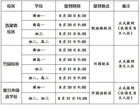 求精中学8月30日新生入住及相关寝室调整高二年级学生报到(住读生12:30前完成入住,全年级学生于13:00在本班教室集中)8月31日高一年级新生9:00报到初一年级新生10:30报到初三年级学生13:00报到初二年级学生14:00报到二十九中2025年8月30日上午8:00重庆二外报到时间:初一新生:2025年8月30日上午8:30—11:30高一新生:2025年8月30日下午14:00-17:00,16:00到教室集中礼嘉中学1.新生年级8月30日8:00-12:002.非新生年级8月31日8:00-12:003.毕业年级以年级组通知为准朝阳中学