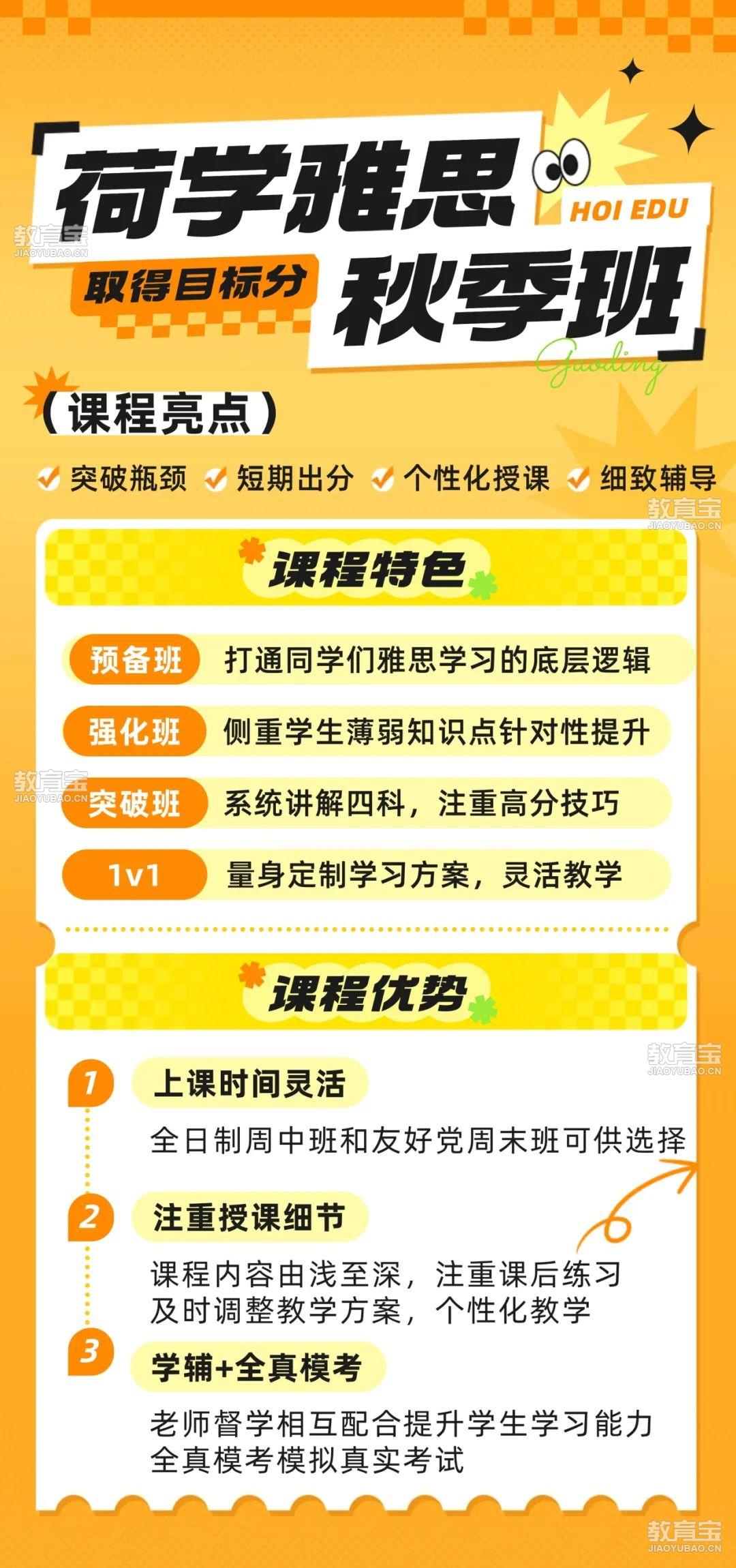 Q长沙荷学教育的师资力量怎么样?A名师团队授课,85%以上的教师具备海归留学背景或硕士学历。6-10年的丰富的教学经验,教授出高分学员无数,升分率高。Q长沙荷学教育有什么优势?A1.一对一或4-6人小班式教学。2.独立自研教材。3.单间自习室。4.地铁口直达Q长沙荷学教育有哪些配套服务?A全真模考、专业督学、作文批改、口语陪练、学习跟进、每日打卡等服务。Q怎么预约免费试听?A扫码咨询