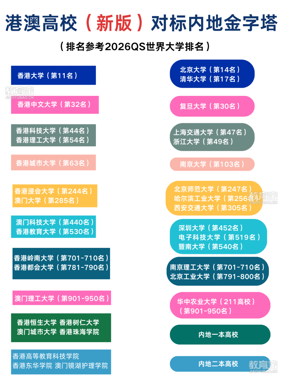 长沙新航道前程留学官方咨询电话18900767506港澳高校近几年热度持续上涨,不仅排名靠前,国际认可度高,而且港澳地区融合了中西方的文化和教育环境,成为不少考生家长高考升学的选择之一。今天帮大家梳理了港澳招生院校名单、实力排名、报考条件及学习生活花费等内容,一起来看!01面向内地招生的港澳高校目前,香港、澳门共21所高校面向内地31个省、自治区、直辖市招收普通高考生,其中香港高校15所,澳门高校6所。详细高校名单如下:香港15所:香港大学、香港科技大学、香港理工大学、香港中文大学、香港城市大学、香港浸会大学、香港岭南大学、香港教育大学、香港珠海学院、香港树仁大学、香港都会大学、香港演艺学院、香港恒生大学、东华学院、香港高等教育科技学院。澳门6所:澳门大学、澳门科技大学、澳门理工学院、澳门城市大学、澳门旅游学院、澳门镜湖护理学院。其中香港中文大学、香港城市大学、香港珠海学院3所院校参加高考录取,按照内地高校统一招生形式招生。香港大学等12所香港高校和澳门大学等6所澳门高校采用的独立招生方式,需要考生自主提交报名申请,才有资格参与后续选拔、录取。02实力排名下图是港澳高校与内地高校2026QS世界大学排名,可以直观了解港澳高校实力情况。?港大对标清华北大?港中文可对标复旦?港科大、港理大与上交大、浙大实力相当
