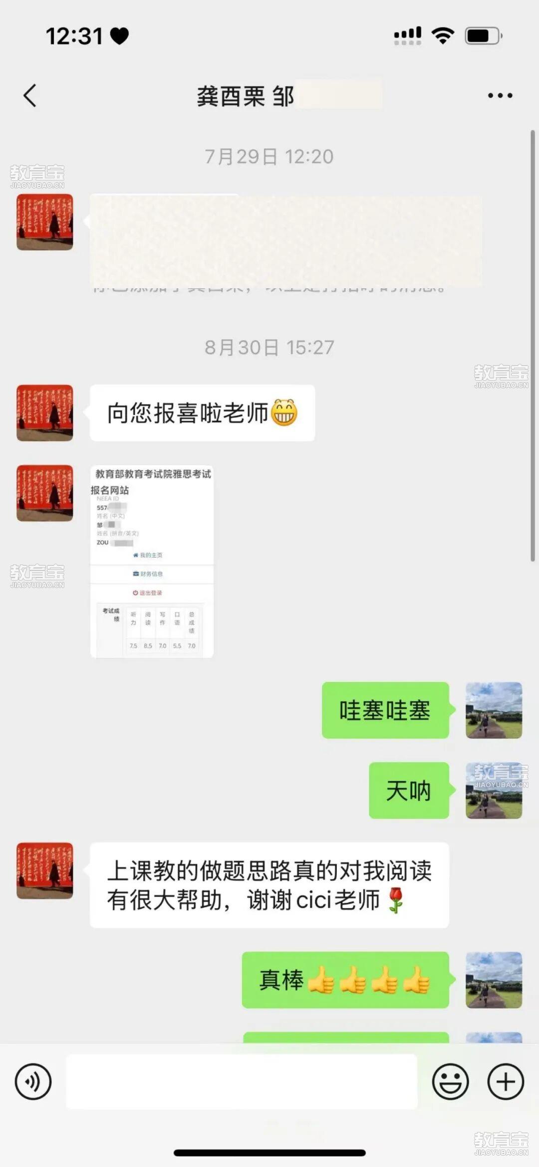 遗憾的是我的口语,不过这个分数也是我的意料之中。一个是我真的比较社恐,再加上我平时缺乏了对口语的练习,考场上我见到考官,一紧张就没有发挥的很好02可以分享一下你听力阅读的技巧吗?可以的。虽然我的听力和阅读基础本来就不错,但是最终看到自己的分数还是超乎自己的意料;特别是听力老师对我的细心指导,让我在听力上有很大的进步刚开始我的听力其实一直是卡在6分的样子,就算我刷再多的题都没有突破瓶颈。后面上课之后,Jojo老师讲解了许多技巧比如如何通过关键句抓全文内容如何高效精听等等,不仅帮助我提高了我的做题速度同时准确度也得到了提升,当然课后还是需要不断去练习课上老师教的技巧