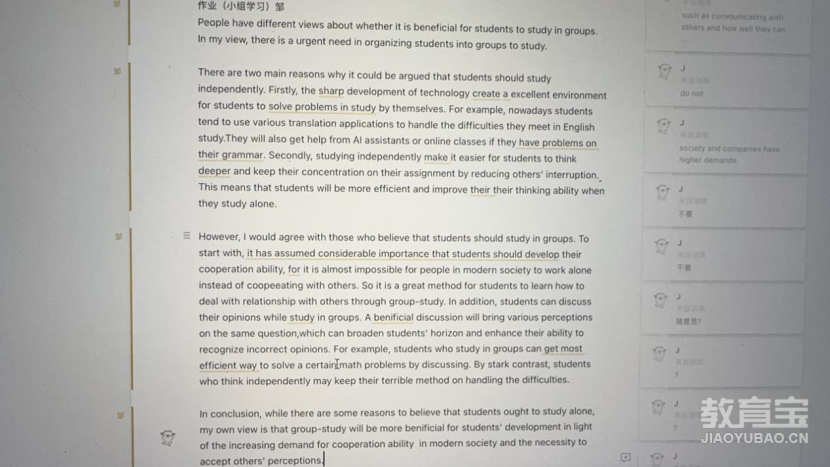 03对于写作你还有什么想要特别分享的吗?说起写作,我真的非常感谢Jill老师,我的每一篇作文她都帮我精细的批改了。我的作文从最开始的语法错误一堆、内容逻辑不清晰到后面的几乎没有语法错误、论证论点清晰、内容逻辑环环相扣真的感谢Jill老师在课程期间的辛苦授课。我在写作的课堂上学到了很多,让我能第一次考就能考出7分这样的*除此之外写作素材的积累也必不可少,老师会经常给我们分享高分素材,并让我们在记忆默写之后加以实际应用到写作中
