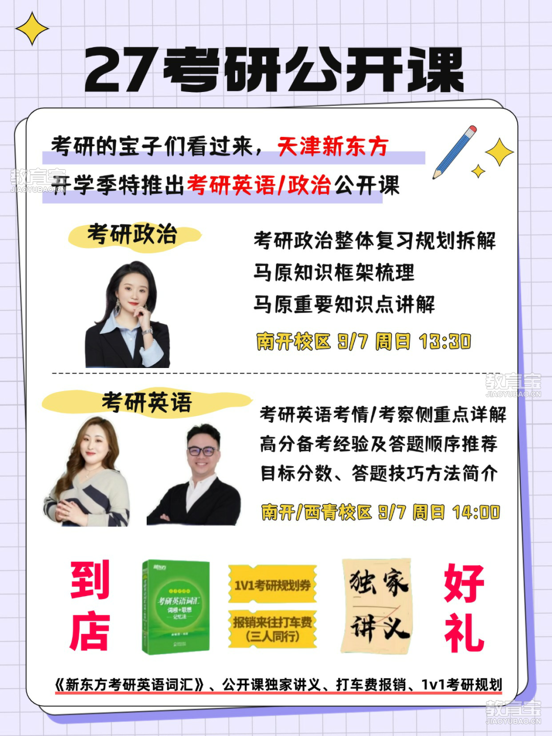 考研这场战役,选择大于努力,方法决定效率!9 月 7 日,来天津新东方考研公开课,跟紧专业讲师的步伐,把学习技巧、备考规划通通“收入囊中”!