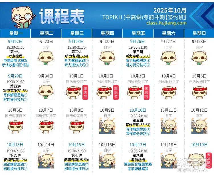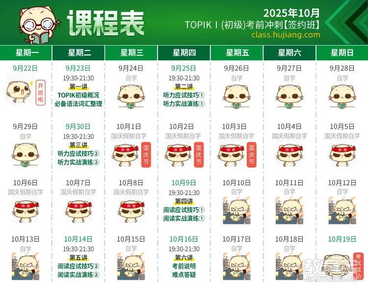 TOPIKⅠ(初级)直播课全程在线直播,6次课共12课时(每次2课时,每课时60分钟),每周二、四晚 19:30-21:30(法定假日休息)。短时间内熟悉初级题型与应试技巧,主打短时高效。学完去考试,没考过2级?免费重读!这安全感!