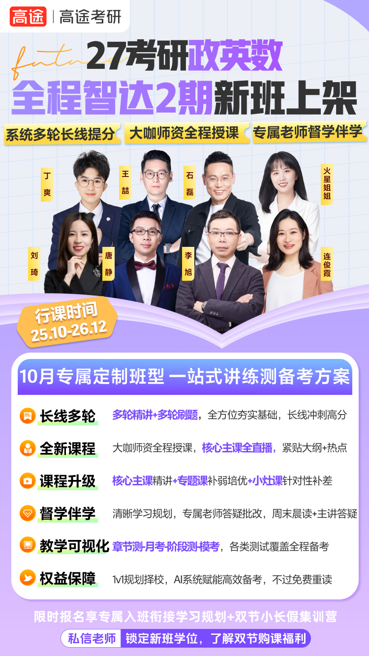 高途考研热门课程如下:1??27考研政英数智达班、27曙光-政英数VIP小班2??26考研冲刺/集训/走读【北京/沈阳/郑州/武汉/西安/济南】3??27考研专业课1V1、专业课智达培优班4??26考研暑政英数专项急救班......班型众多,招生优惠价格,针对课程想要咨询&了解,请扫二维码,老师立即与您沟通并为您详细介绍。??