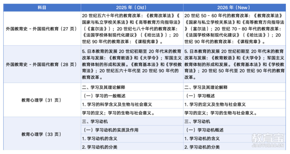 点击蓝字 关注我们考研是一场信息战,而考研大纲就是我们备考路上的“指南针”和“风向标”。出题人的出题依据,就是大纲。所以请一定记住:考研大纲的变化,不能忽视!不紧跟大纲范围复习,就容易陷入“无效备考”的误区,事倍功半!01什么是考研大纲?「考试大纲」和「考研大纲」虽然只有一字之差,但区别却很大。考研大纲:由教育部官方统一发布。侧重公共课考察范围,包括考试范围、考试要求、考试形式以及试卷结构等,还会提供一些考察内容的附件,例如新增大纲词汇。一般会在9月中发布。考试大纲:是各院校自行发布,一般还会和招生目录一起公布。侧重于专业课考研范围,包括考试内容范围说明和专业课考察目录、参考书目。根据各个院校自行决定,8-10月不等,目前已经有部分院校公布了考试大纲。总结来说,「考研大纲」和「考试大纲」就是考试范围,虽然不一定会全部都考,但考试内容不会超出这个范围。02大纲需要关注哪些内容?通过考研大纲,我们可以:掌握今年各科的题型与分值变化。合理推测命题趋势与侧重点。及时调整复习方向,优化备考计划。而在所有内容中,*需要关注的,就是与往年不同的部分,具体来看:考研政治:大纲是每年变动*大的部分,考生们一定要重点关注。考研英语:大纲通常会有一些小变动,一般是单词量的增减。考研数学:大纲相对比较稳定,但也会有一些细微的变化。0326考研大纲新变化政治大纲史纲:修改了1处:“洋务运动的历史作用及其失败”变为”洋务运动的历史作用及失败“。形势与政策:考查时间从“2024 年1-12月”调整为“2025 年1-12月”。除此以外,无其他变动。英语大纲大纲上有一个单词拼写增加了连字符,counterclockwise→counter-clockwise。其他无变化。数学大纲知识点上,无变化。管综经综大纲大模块均无变化。计算机大纲整体无变化。教育学大纲外国教育史2处写法变化,教育心理学2处内容变化,其他无变化。