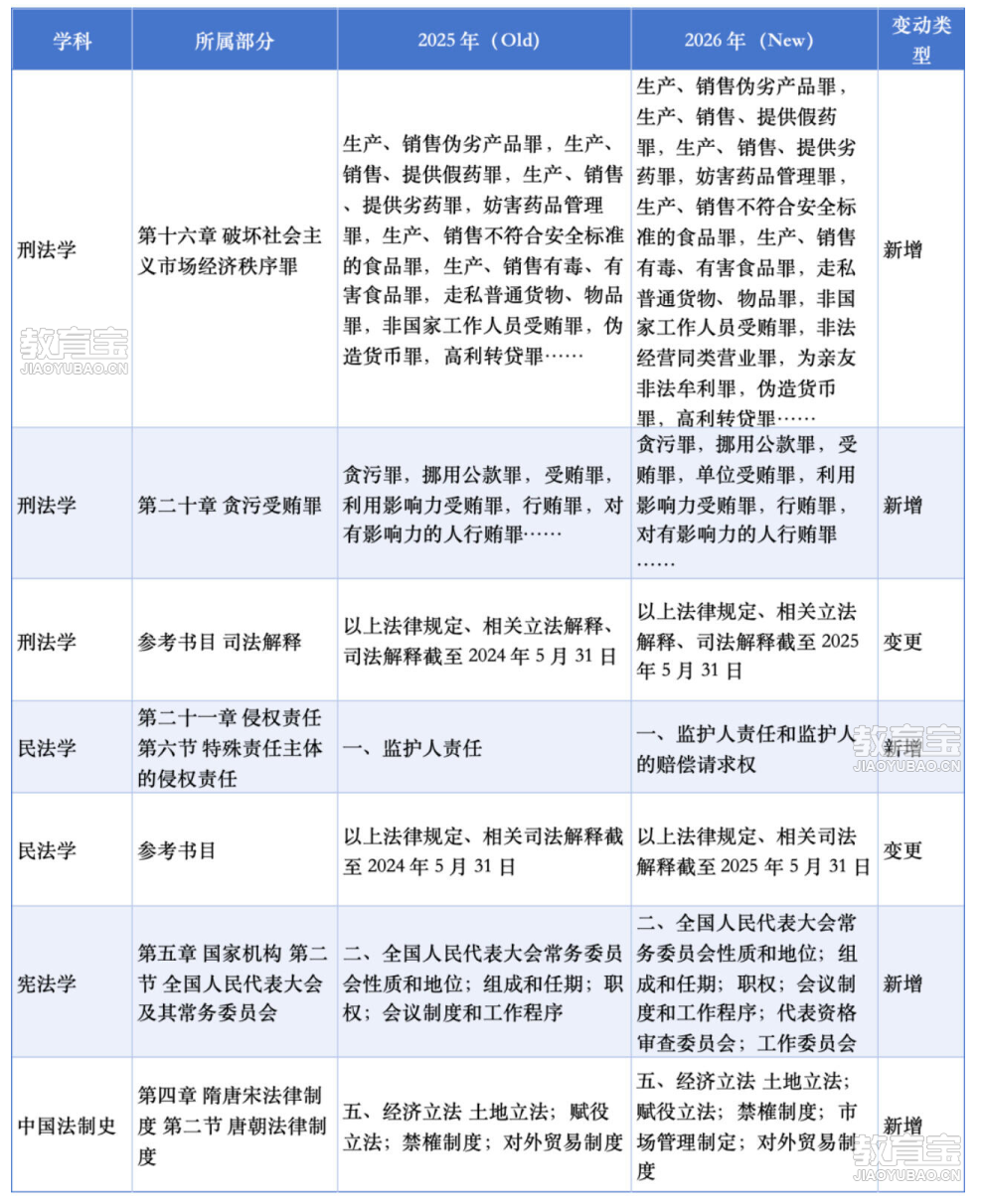 法硕大纲刑法学:2新增1变更,民法学:1新增1变更,宪法学:2新增,中国法制史:1新增,其他方面无变化。