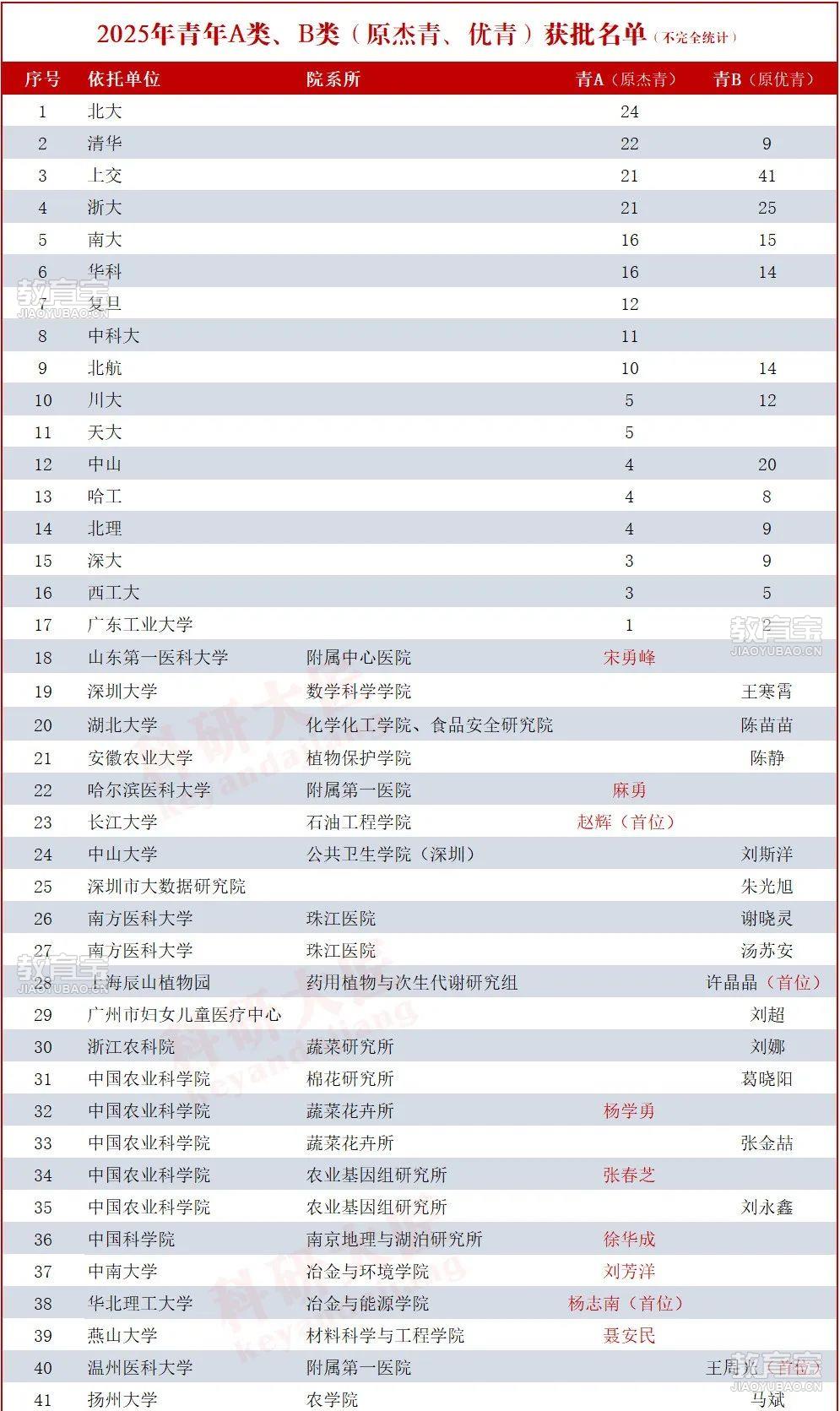 写作发表不难,就找艾思科蓝据不完全统计,目前长江大学、华北理工大学、燕山大学、哈尔滨医科大学、中山大学、中南大学、山东第一医科大学、南方医科大学、深圳大学、湖北大学、扬州大学、安徽农业大学、中国农科院、浙江农科院、中国科学院等20余所高校机构公开披露了获批情况,其中包括长江大学、华北理工等高校实现都实现了历史性突破,获批该项目。2025年青A、青B资助统计国家杰青(青A)数据:排序:清北、交浙、南/华科、复旦、科大。部分高校入选数:上海交通大学 21 人,浙江大学 21 人,华中科技大学 16 人(并列第五)。优青(青B)数据:规模:扩至 800 人。部分高校入选数:上海交通大学 41 人,浙江大学 25 人,中山大学(杰青 4 人、优青 20 人)