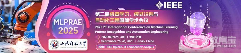 3、【IEEE独立出版 | EI/SCOPUS稳定检索】第二届机器学习、模式识别与自动化工程国际会议(MLPRAE 2025) 邀您参与!?? 大会官网: www.mlprae.com?? 时间: 2025年9月26-28日?? 地点:山东济南?? 主办: 山东师范大学(已确定线下,线上同步)?? 收录检索: IEEE Xplore, EI Compendex, SCOPUS (往届EI已检索)IEEE-ISBN号: 978-1-6654-5742-2?? 征稿火热进行中!涵盖领域:机器学习 | 深度学习 | 模式识别 | 图像处理进化计算 | 智能优化算法 | 数据分析与挖掘机器人控制 | 自动控制系统 | 智能交通 | 自动化监控系统...(更多主题详见官网)投稿入口: https://www.ais.cn/attendees/paperSubmit/YIVEQV?invite=G8057参会报名: https://www.ais.cn/attendees/toSignUp/YIVEQV?invite=G8057*填写 推荐码 G8057 投稿/参会,可随时追踪审核状态!