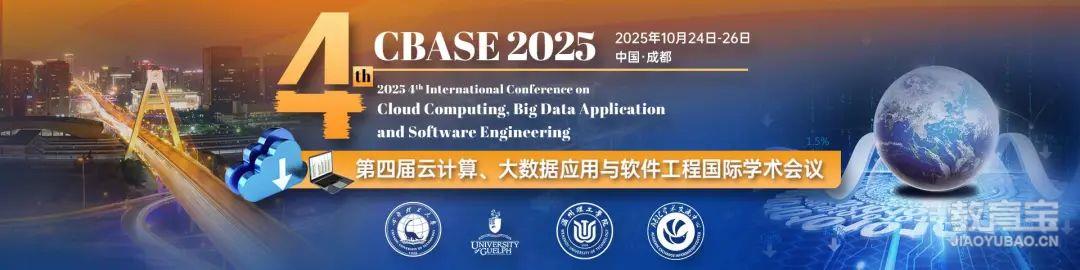 7、【IEEE丨重点会议丨EI稳定丨多所高校联办丨院士、Fellow参会+规模层次高丨早鸟优惠】第四届云计算、大数据应用与软件工程国际学术会议 (CBASE 2025)2025 4th International Conference on Cloud Computing, Big Data Application and Software Engineering时间:2025年10月24-26日地点:中国·成都·成都理工大学(线上线下同步举办)官网:www.ccbase.org(1)审稿录用:约3-7个工作日(2)截稿时间:多轮征稿,咨询大会组委会(3)出版检索:IEEE出版,提交EI、Scopus、IEEE Xplore检索(4)组织单位主办单位:成都理工大学、温州理工学院、加拿大圭尔夫大学、四川省人工智能学会承办单位:成都理工大学计算机与网络安全学院协办单位:温州理工学院数据科学与人工智能学院、加拿大圭尔夫大学工程学院、广东省艾思信息化学术交流研究院、AEIC学术交流中心支持单位:加拿大圭尔夫大学工程学院高级机器人与智能系统实验室(5)会议主页:https://www.ais.cn/attendees/index/JFQURA