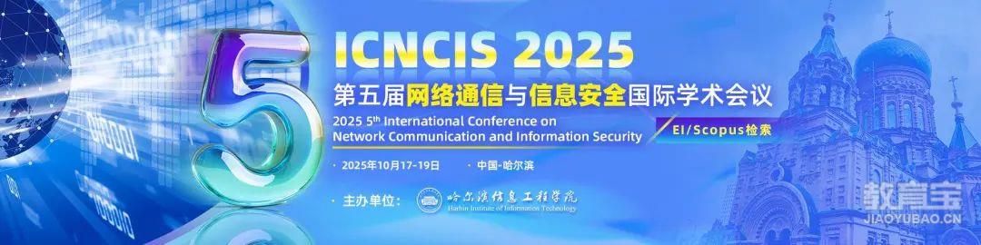 6、【IEEE出版 | 哈尔滨信息工程学院主办 | 连续4届稳定EI检索|高录用】第五届网络通信与信息安全国际学术会议(ICNCIS 2025)大会官网:www.icncis.org大会时间:2025年10月17日-19日会议地点:哈尔滨截稿日期:详见会议官网录用结果通知:投稿后3-5个工作日内收录检索:EI, SCOPUS,IEEE Xplore投稿链接:https://www.ais.cn/attendees/index/2EFBAQ?invite=B8093征稿主题:网络与通信技术,网络工程与安全,信息系统安全与管理,云计算与物联网安全,信息安全算法与协议等相关主题均可投递,详情见官网或咨询大会秘书