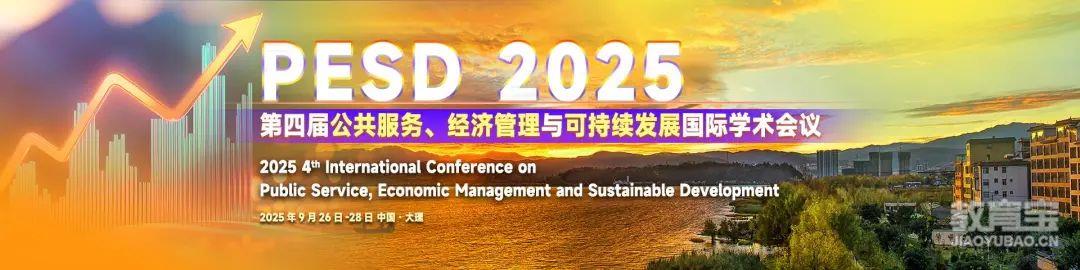 13、【经管类征稿丨口头报告丨CNKI知网、谷歌学术检索】第四届公共服务、经济管理与可持续发展国际学术会议(PESD 2025)大会官网:www.ic-pesd.org大会时间:2025年9月26-28日大会地点:中国-大理(线上线下结合)录用通知:投稿后1-4个工作日征稿范围(包括但不限于):公共安全数字化,数据隐私保护,城市公共管理与公共服务,公共服务质量监管与评估,公共服务网络建设,劳动和社会保障,金融经济学,经济发展,人力资源,信息系统,信息经济与管理,商业管理,可持续发展目标,循环经济,可再生能源,环境保护,绿色生活等。参会类型:论文投稿(包含1个参会名额)丨听众丨口头报告丨海报展示投稿链接:https://www.ais.cn/attendees/paperSubmit/Q7ZUYQ?invite=D226参会报名链接:https://www.ais.cn/attendees/toSignUp/Q7ZUYQ?invite=D226
