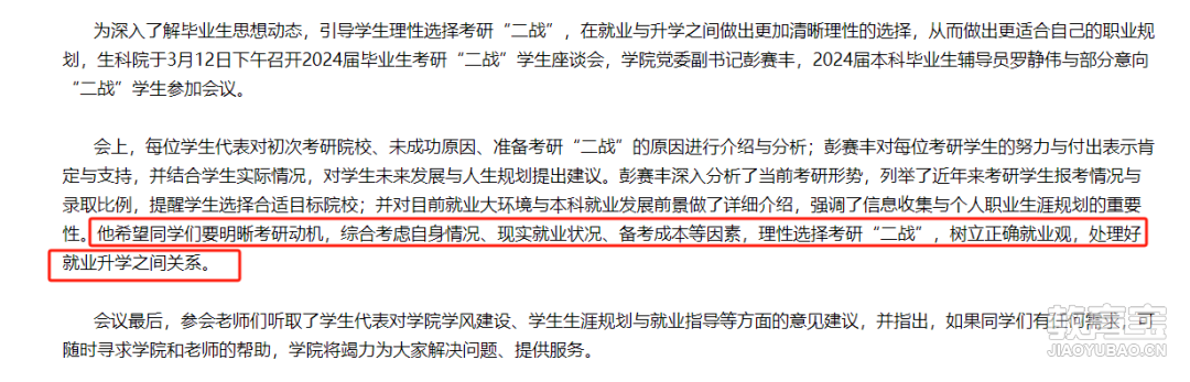 ?湖南师范大学:生命科学学院2024年曾开展考研“二战”毕业生座谈会,建议同学明晰考研动机,综合考虑自身情况、现实就业状况、备考成本等因素,理性选择考研“二战”,树立正确就业观,处理好就业升学之间关系。
