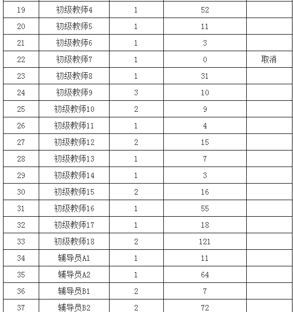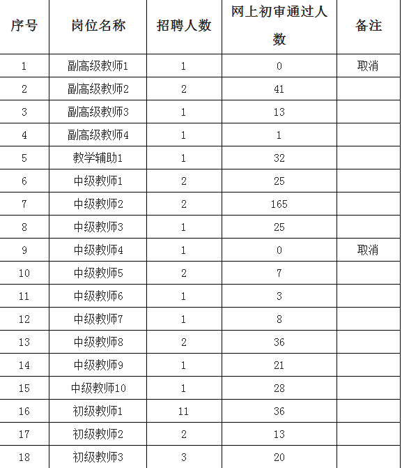山东交通职业学院2025年公开招聘人员网上报名及初审工作于2025年7月12日结束。根据省委组织部、省人力资源社会保障厅《关于印发2025年度省属事业单位公开招聘工作实施方案的通知》(鲁人社发〔2024〕15号)和《山东交通职业学院2025年公开招聘人员实施方案》的规定,对应聘人数达不到1:3规定比例的招聘岗位,计划招聘1人的,取消招聘岗位。根据报名及初审情况,本次公开招聘人员取消招聘岗位3个,为副高级教师1岗位、中级教师4岗位、初级级教师7岗位。