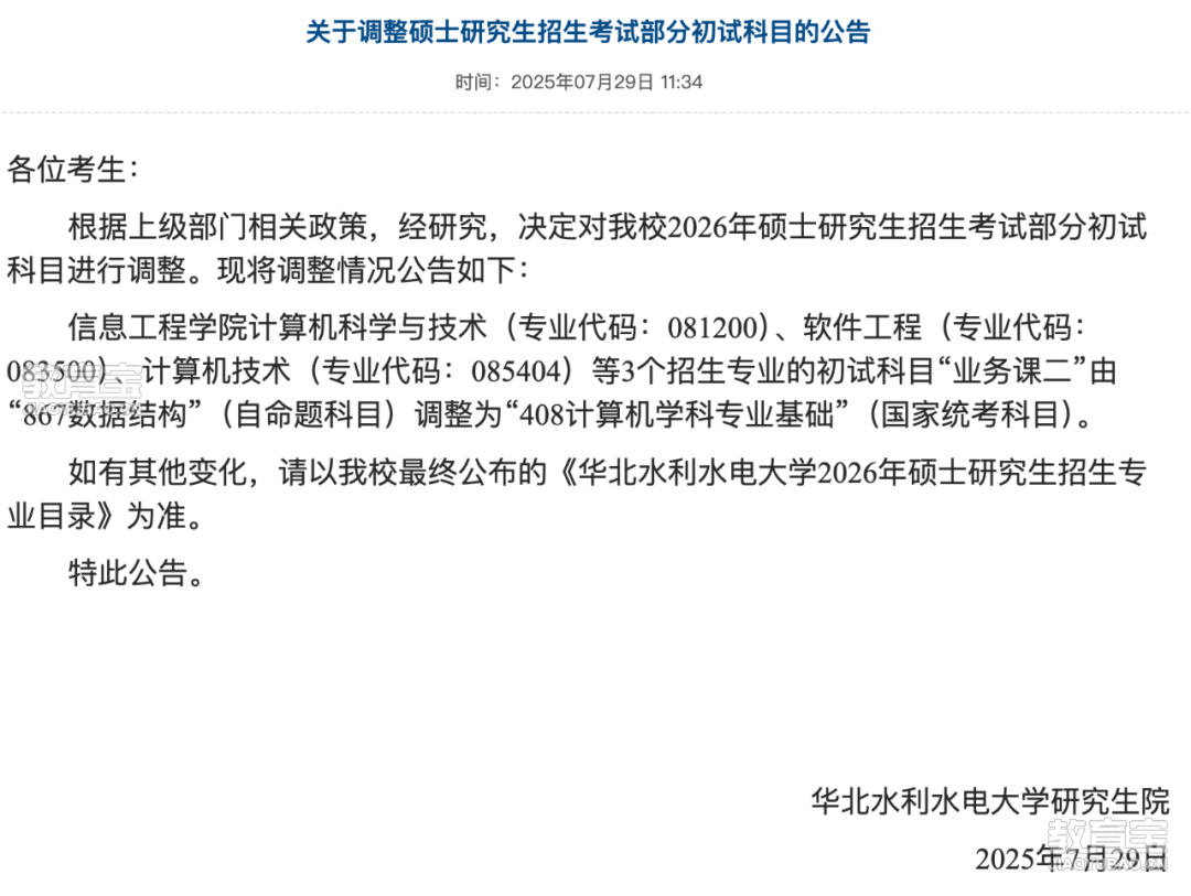 原文链接:https://grs.gdou.edu.cn/info/1029/7371.htm 华北水利水电大学 华北水利水电大学发布了关于调整硕士研究生招生考试部分初试科目的公告。