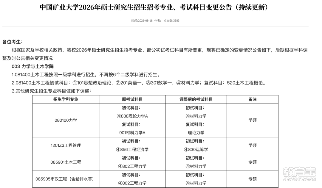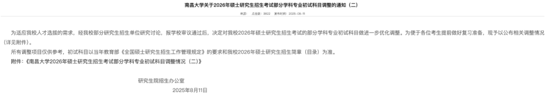 原文链接:https://gs.cumt.edu.cn/info/1055/4085.htm 南昌大学 南昌大学发布了关于2026年硕士研究生招生考试部分专业初试科目调整的通知(二)。