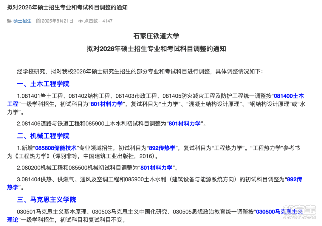 原文链接:https://yjsy.ncu.edu.cn/tzgg/689578ebfa194aaabfaa64469d75e2f6_mobile.htm 石家庄铁道大学 石家庄铁道大学发布了拟对2026年硕士招生专业和考试科目调整的通知。