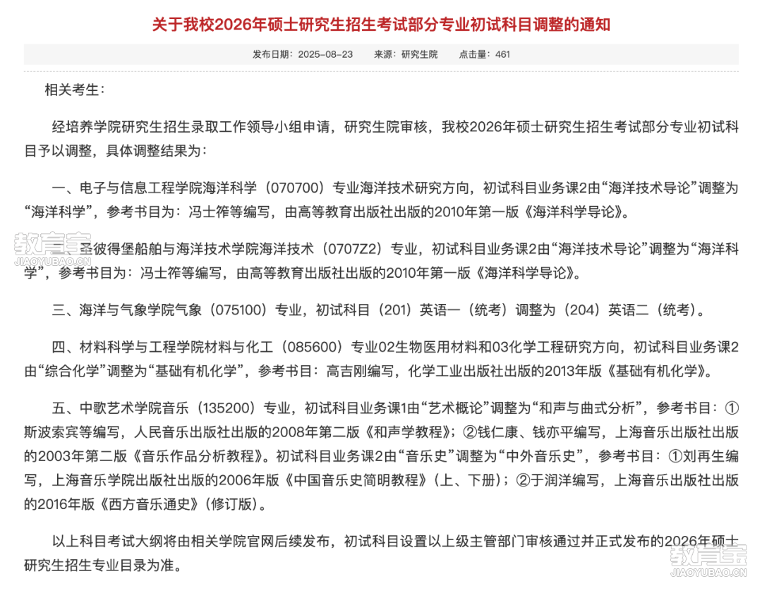 眼看进入9月,26考研就正式拉开序幕了!近日又有多所学校发布了26考研初试科目调整通知,专业课初试科目大改,赶紧来看看!广东海洋大学广东海洋大学发布了2026年硕士研究生招生考试部分专业初试科目调整的通知。原文链接:https://grs.gdou.edu.cn/in...