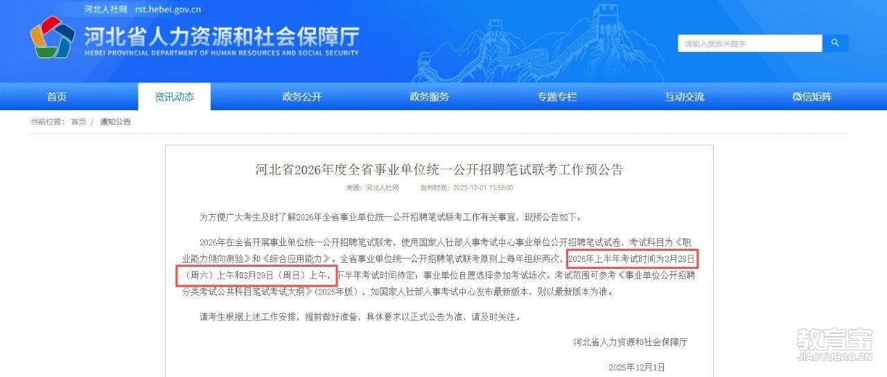 2025/12/7 0:03:59河北省人力资源和社会保障厅12月1日(2025年)发了2026年度全省事业单位统一公开招聘笔试联考的预公告。预公告里说,2026年全省要搞事业单位统一公开招聘笔试联考,用的是国家人社部人事考试中心的事业单位公开招聘笔试试卷,考两门:《职业能力倾向测验》和《综合应用能力》...
