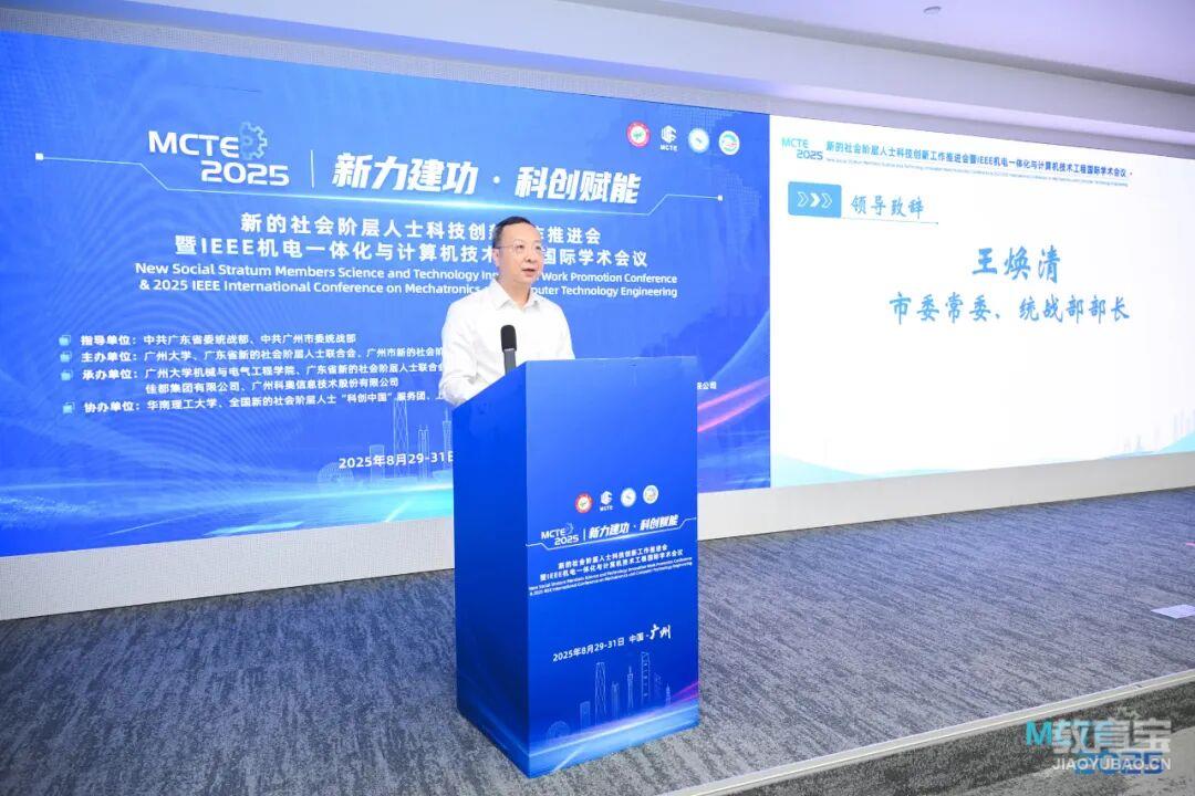 8月30日,由广东省委统战部、广州市委统战部指导,广州大学、广东省新的社会阶层人士联合会、广州市新的社会阶层人士联谊会联合主办的“新力建功·科创赋能”新的社会阶层人士科技创新工作推进会暨IEEE机电一体化与计算机技术工程国际学术会议(MCTE2025)在广州举行。广东省委统战部、广州市委统战部、广州大学负责同志,省市科技、工信、科协、社科院等部门有关负责同志,“科创中国”服务团和新联会代表,以及国内相关科研院所、高校专家学者等约200人参加。
