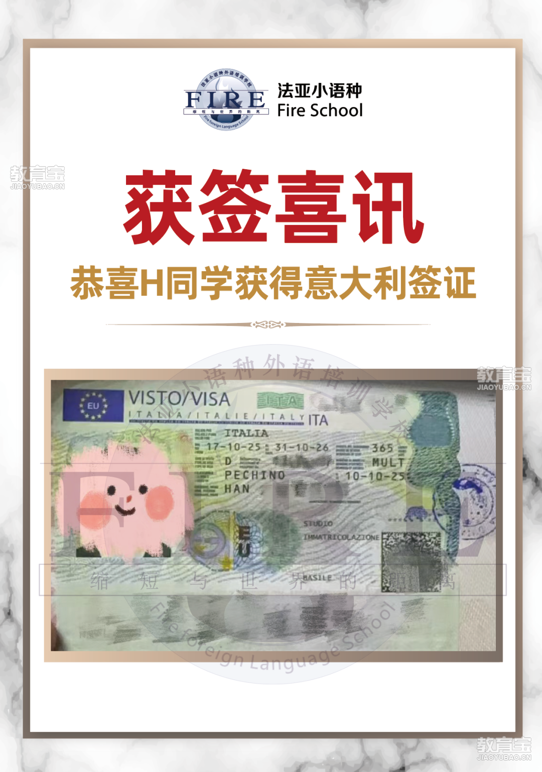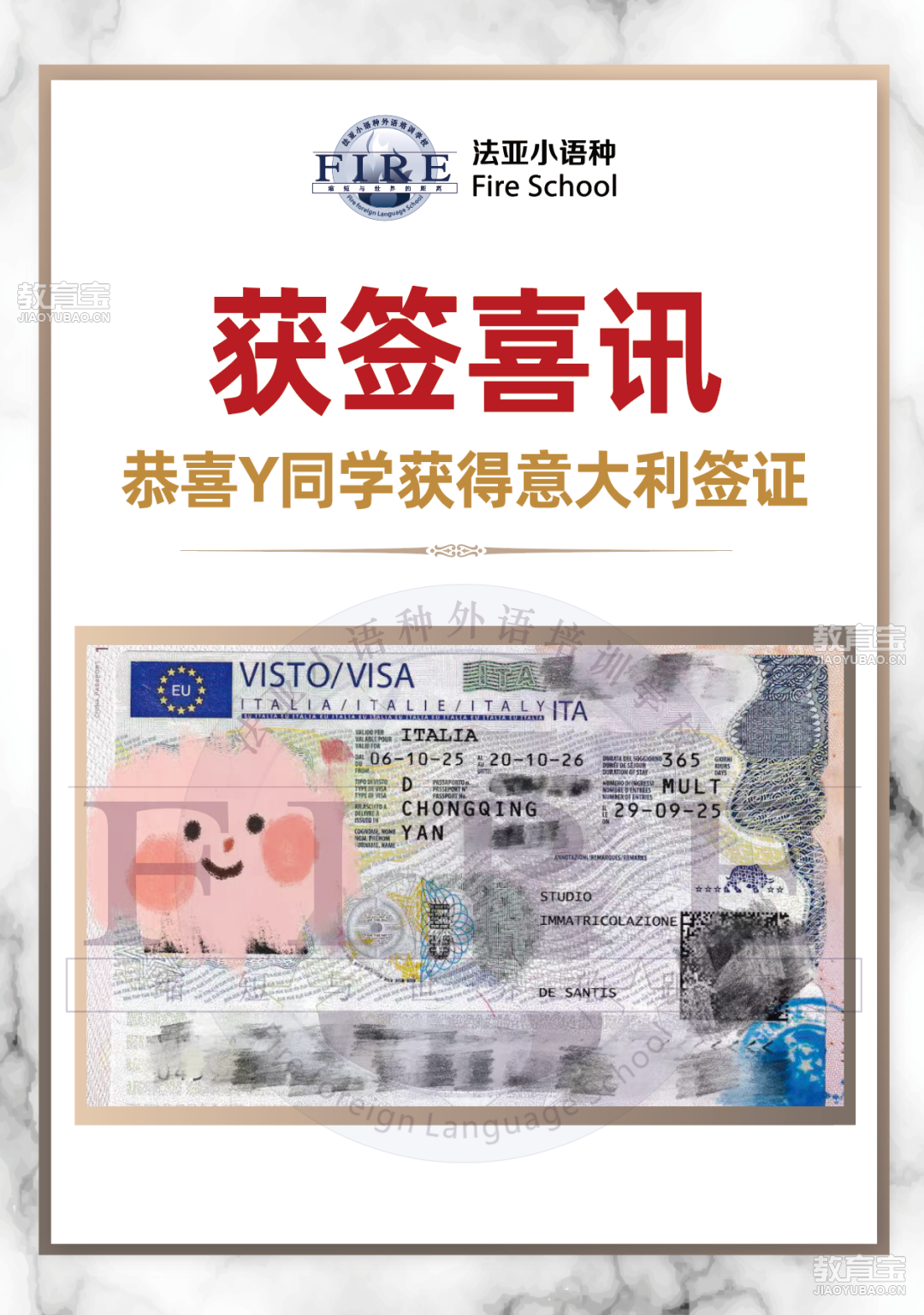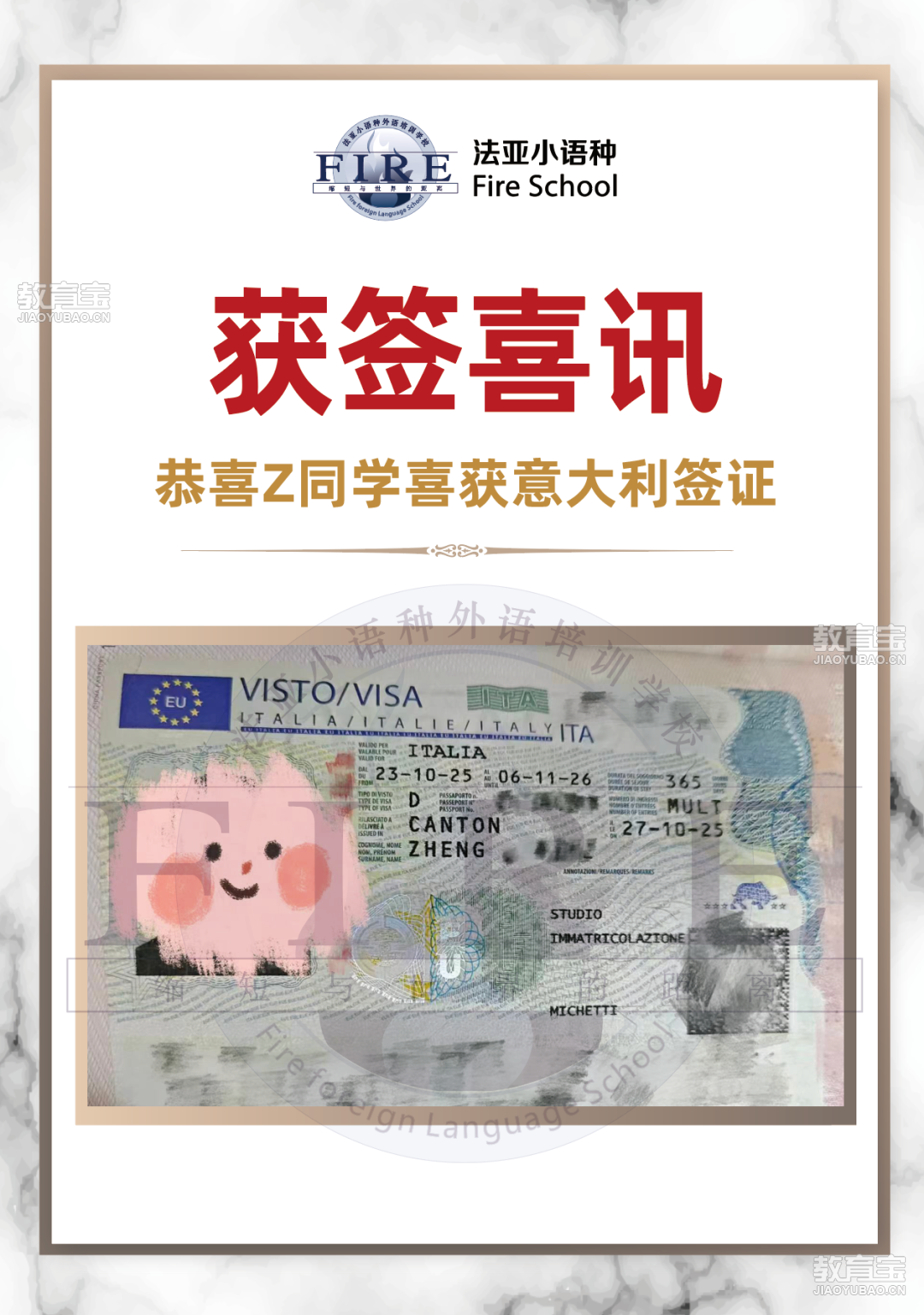 法亚头条2025.11.03法亚喜报FIRE News 11月03日 星期一 ?? 喜讯满满 ??10月, 法亚小语种收获多张语言证书及欧洲留学签证:??1位学员通过法语DELF B2等级考试??1位学员通过法语TCF B2等级考试??1位学员通过法语TCF B1等级考试??1位学员通过德语?SD(奥德) A1等级考试??1张意大利巴里美术学院offer??3张意大利留学签证??3张德国留学签证恭喜所有收到喜讯的学员!??从零基础的语言学习到落地欧洲留学,法亚小语种将全程为你保驾护航!如果你也想收获 法、德、西、意、俄 的语言*单和学校offer和留学签证,欢迎后台找老师详细咨询哟~ ??