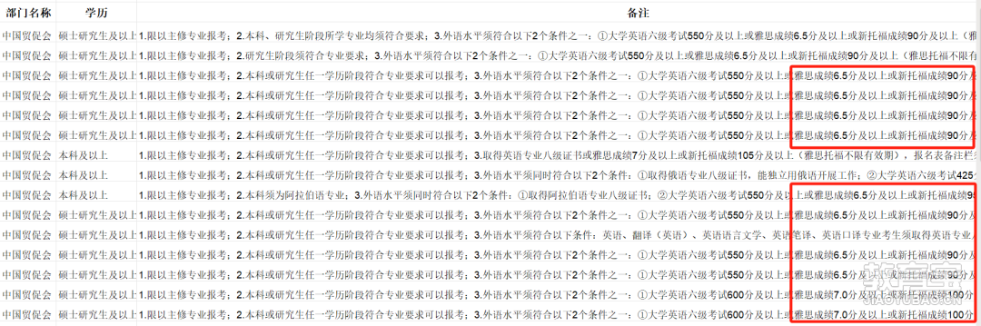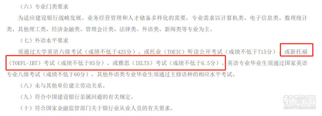 (注:以上图片信息源自中央机关及其直属机构2026年度考试录用公务员招考简章)实际上,除了留学、移民和考公以外,雅思/托福*也是国内升学及很多行业都认可或要求的英语能力。进入外企的敲门砖随着全球化的发展,越来越多的求职者需要具备一定的英语能力才能从众多的竞争者中脱颖而出。而雅思、托福等语言*成为*常被外企认可的英语能力测试。毕竟,在外企单位会经常接触到外国客户并进行交流,没有足够的英语能力是没办法胜任工作的。进入国企的加分项部分国企在校园招聘的过程中会对求职者的英语水平有一定要求,例如在中国建设银行总部2026年度校园招聘公告中,要求应聘者的六级*不低于425分,或雅思*不低于6.5分,或新托福*不低于85分。