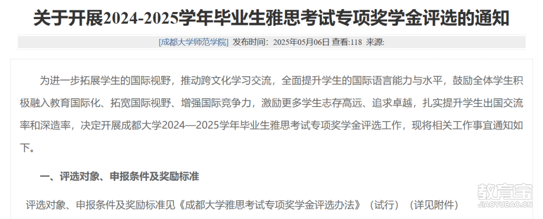 图源:中国建设银行总部2026年度校招公告申请奖学金+报销考试费很多国内院校还设立了雅思专项奖学金,以此来激励学生报考雅思考试提升英语水平。比如,成都大学师范学院设置了毕业生雅思考试专项奖学金,依据不同分数给予学生不同的奖金或给学生直接报销考试费!
