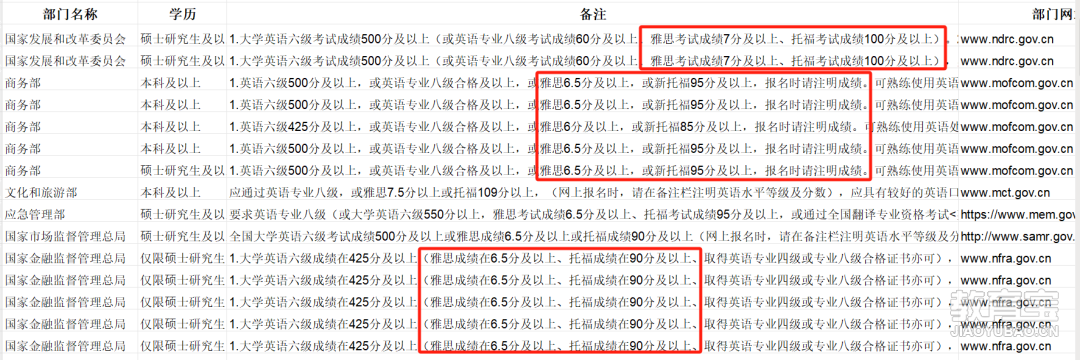 中央国家行政机关多个岗位要求或承认雅思/托福*