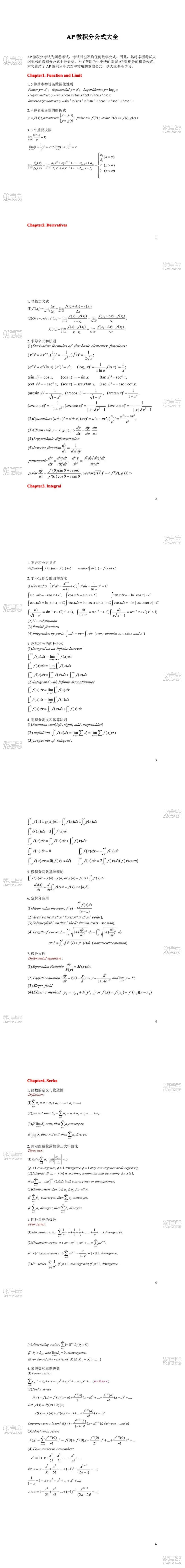 需要宏观上掌握的一些基本思想与理解:1极限的思想,简单来说,极限就是一个动态逼近过程产生一个确定结果。极限的理解会贯穿于整个AP微积分BC的学习过程中,这也是为什么要把极限放在进入微积分学习主体学习的第*章,很多概念的定义和判定都与极限紧密联系。2导数的定义,图像上就是某点处的切线斜率,应用题中表示瞬时变化率。导数的存在性可转化为极限的存在性去判定。3积分的意义,不定积分表示的是求导后为同一个函数的一类函数,定积分表示由曲线和上下限所围成的封闭面积。4反常积分的求解无论是趋于无穷的类型还是积分上下限中有断点的类型本质上都是转化为极限表达去计算。计算处准确数值则收敛,反之则发散。5微分方程求解分离变量是关键,还原主体再求解。这部分需要重点注意一下对数模型的分析与变化,其次欧拉近似求解的关键是线性化近似求解的重复。6级数部分看类型,特定条件判收敛。不同类型级数的收敛条件已经详细总结在思维导图上,注意把握重点。同时使用不同方法检验收敛时注意名称和用法。最后,附赠AP微积分BC的公式总结表和2025年真题一套,大家可以根据学习进度及时进行检验!祝大家AP微积分BC的学习之路一路高歌,5分折桂!··