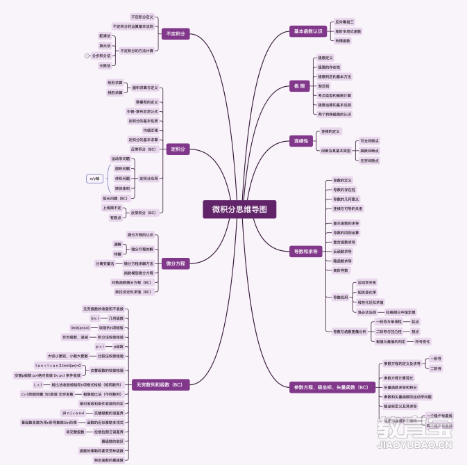 起初高一你在AP预备微积分的学习上游刃有余,不曾想也就是过了个暑假,为何高二的AP微积分BC像是变了个天,突感不适难度增加。这里面的问题主要是数学认识主体从“形”的临摹到“魂”的交摄,抽象性的理解有大幅上升。AP预备微积分学习的主体只要认识基本函数类型就行了,但是进入AP微积分后,考察主体需要同学们理解和应用好微积分的基本思想,这就不怪同学们有所吐槽偶有苦恼了。那么,AP微积分BC既然已经躬身入局,如何破局解此困顿?不妨好好细品这张思维导图!