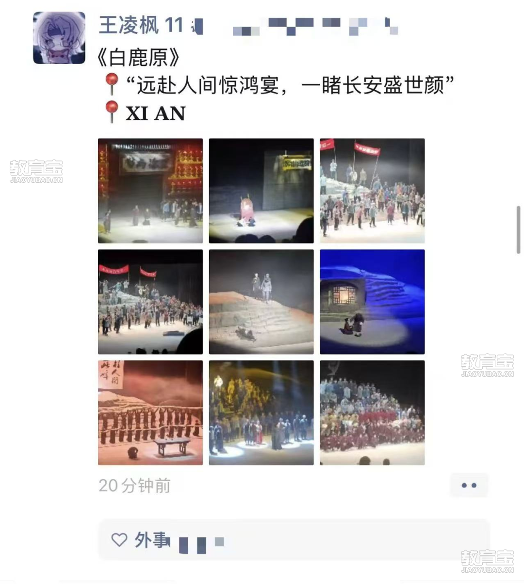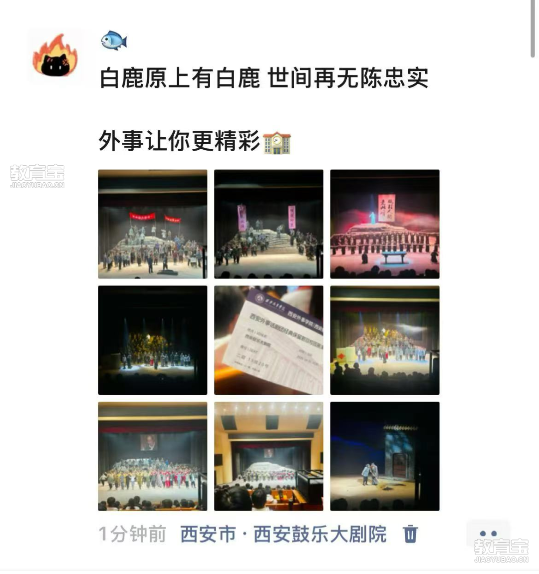 朋友圈里的感动瞬间演出结束后,新生们的朋友圈被《白鹿原》的剧照和感悟”刷屏“。”这是入学以来*震撼的一晚!“一位同学在朋友圈这样写道,配图是九宫格剧照和自拍,收获了无数点赞和评论。这些自发的分享,让这场艺术盛宴的影响力持续扩散,也成为新生们共同的温暖记忆。