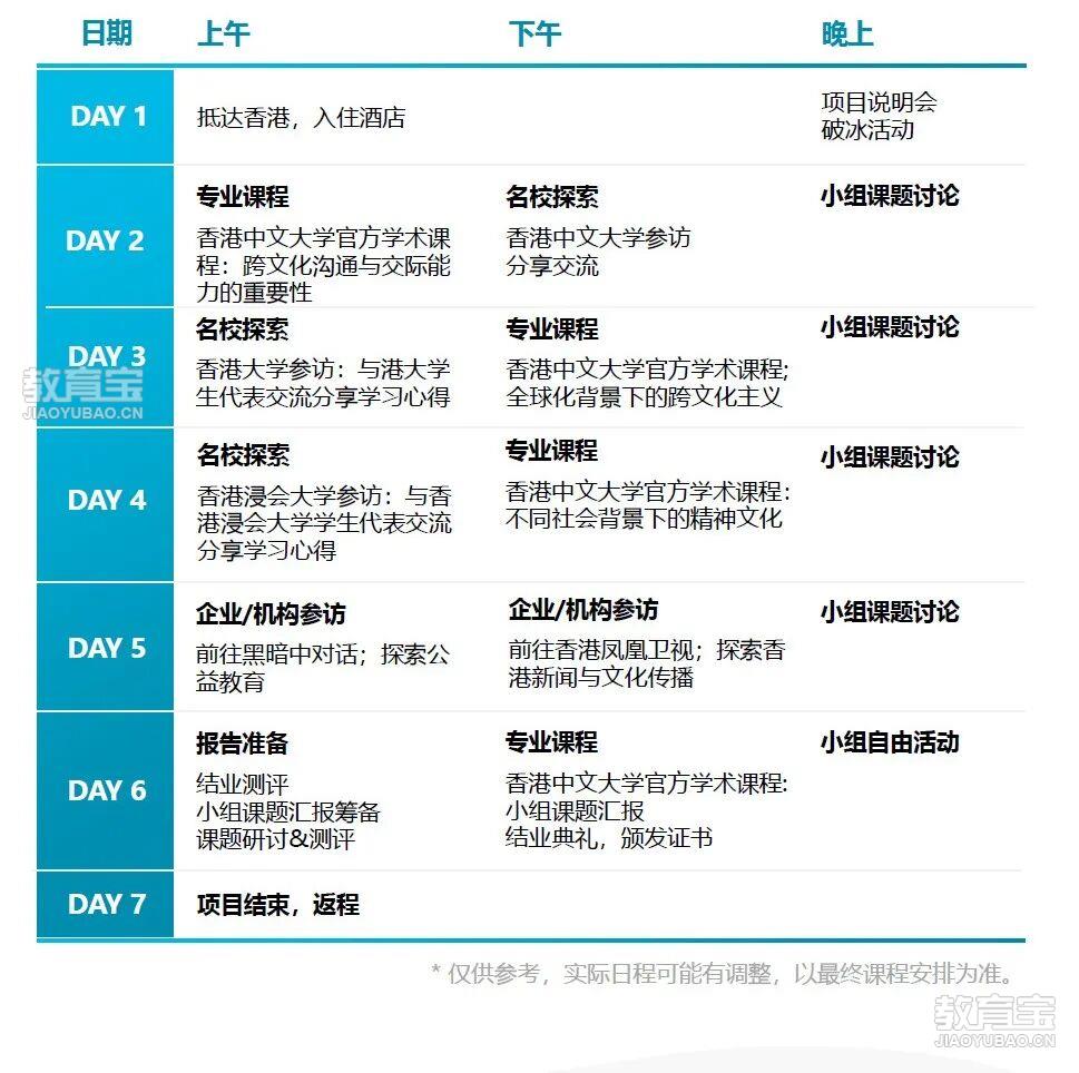 项目Q&A住宿情况:项目组会为学生统一预订四星级酒店,两人标间,配有独立卫浴,免费无线上网等设施。交通安排:项目期间统一行程会安排统一大巴接送。项目开始日和结束日,在香港机场/香港西九龙高铁站提供固定时间接送机和接送站,具体时间安排在项目开启前1个月内公布。用餐安排:在校课程期间一般在学校食堂用餐,参访及探校环节在活动地点附近/参访学校食堂用餐.费用自理。境外安全:项目全程配有领队,帮助学生解决境外遇到的问题,并为学生购买覆盖项目日期的境外保险,包含航空险和境外医疗险。遇到需要保险理赔的情况,领队老师会给予陪同和指导。出境证件:学生需自行前往派出所的出入境管理局办理港澳通行证及至少一次香港旅游签注。具体办理指导可咨询相关老师。项目费用项目费:10500(团组接送机、课程、文化参访期间的司导费用、保险等)其他费用参考(均不含食宿和机票):住宿:我们会统一帮学生们预订4钻级酒店2人标间,预计2100元/人 吃饭:都是统一行动(学校食堂、酒店附近),自己支付,预计100-150元/天证件:港澳通行证及签注需自行前往出入境办理,预计70元交通:需自行前往香港集合,机票、车票往返根据自身情况自行预订,费用可通过订票软件自行查看其他个人花费