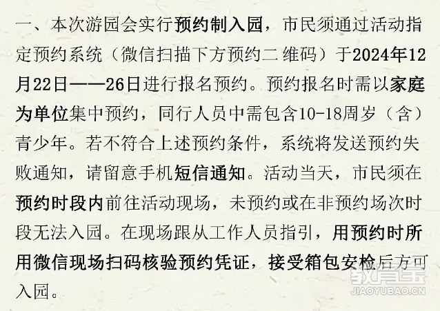 01 基础安排游园会时间:2026 年 1 月 1 日,当天同时处于元旦假期(1 月 1 日 - 3 日),1 月 4 日将按双周星期五课表上课。开放对象:全校师生,以及 10 周岁(含)以上社会市民;毕业校友可通过专属通道预约。特别提醒:游园会仅为校园文化展示活动,与升学无关,现场不接收JL。02 预约与入场规则参考往年流程,游园会将采用小程序预约制,具体安排如下:预约方式:以家庭为单位集中预约,同行人员需包含 10-18 周岁(含)青少年,不符合条件将收到预约失败通知。入场核验:活动当天需在预约时段内到场,凭预约微信扫码核验凭证,并接受箱包安检后入园;未预约或错过预约时段无法进入。校友通道:毕业校友可联系在校老师,在指定时间前通过访客系统完成预约。