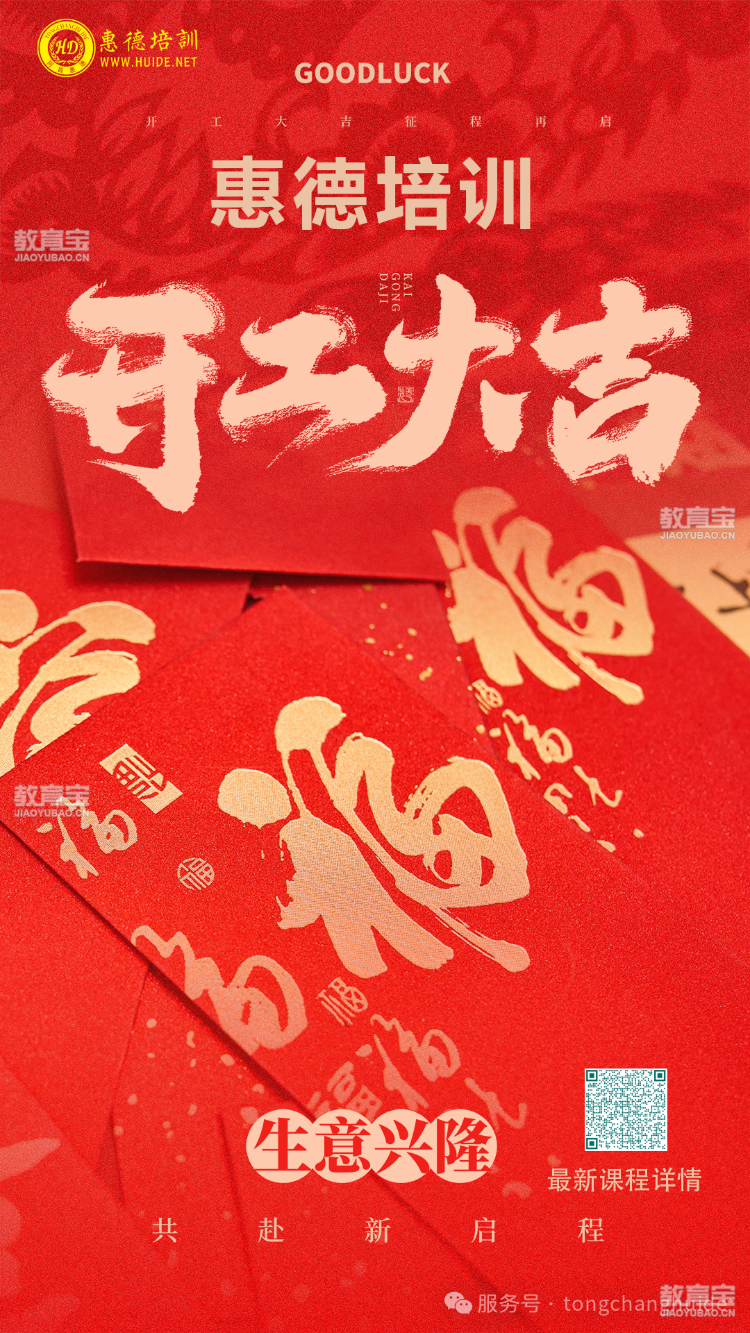 ?开工大吉,恭喜发财,财源广进,福气多多,吉祥如意,贵人相伴,好运常在,好事连连,大展宏图,前程似锦!惠德培训隶属于北京同昌惠德科技有限公司,成立于2004年,专注于客户关系管理(CRM)、客服技巧与服务营销、数据分析、企业电子商务、企业数字化转型、微软Dynamics 365商务管理管理软件、微软人工智能Copilot等专业领域内的培训及咨询服务。