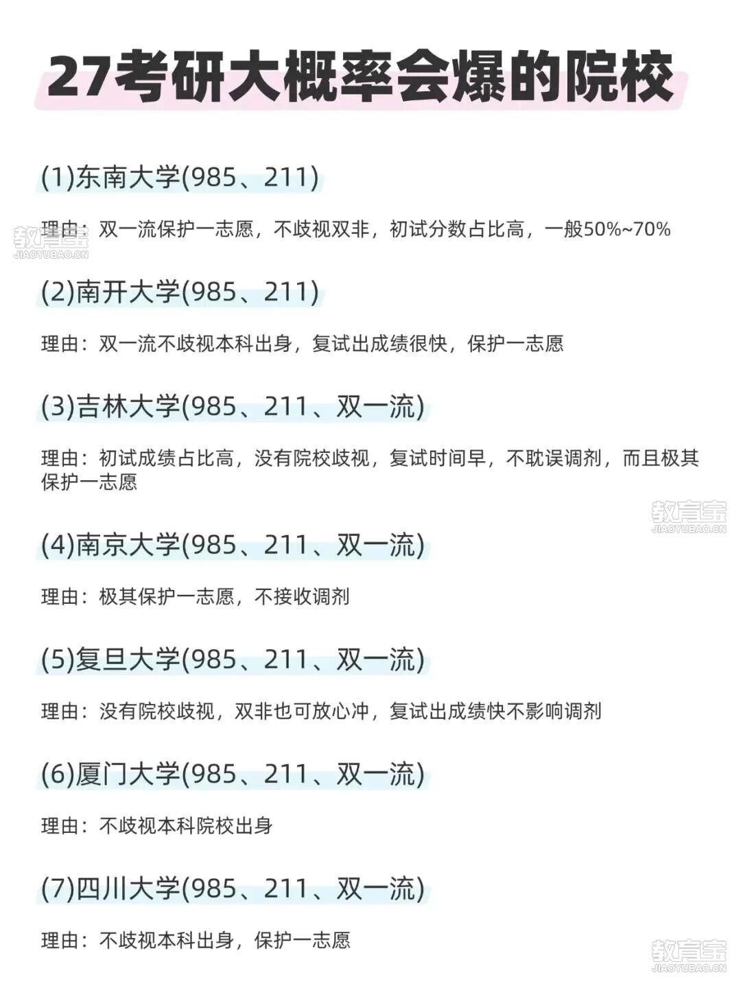 ??27早鸟抢跑计划 老师带你择校备考??27考研:90%会爆的学校!!!??考研第一步,先确定目标专业院校??今天根据以往经验,整理了明年可能会爆的院校??大家可以重点参考,再结合自己实际情况 做最后的确认哈
