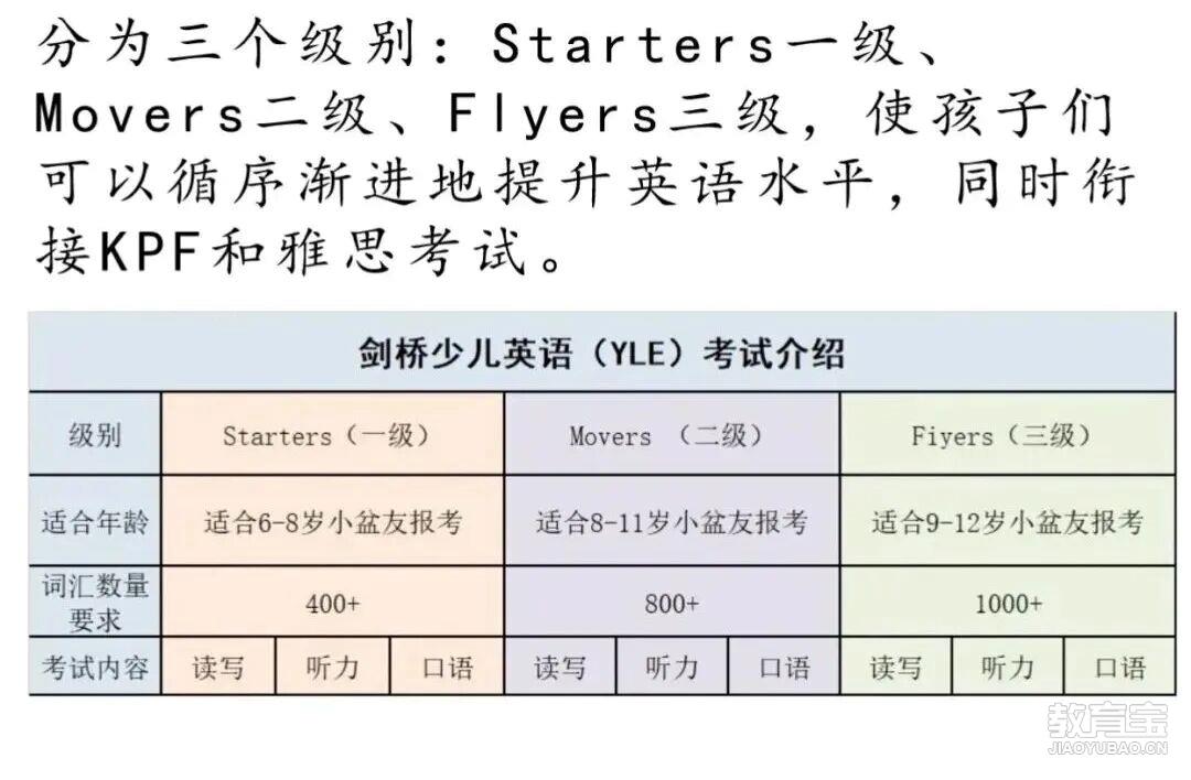 2025/11/19 0:08:40不少家长搞不清YLE和KET、PET的关系,其实俩压根不是一回事儿——剑桥少儿英语(YLE)全称Young Learners English Tests,是专门给小朋友设的考试,分Starters(一级)、Movers(二级)、Flyers(三级)三个级别;而KET、P...
