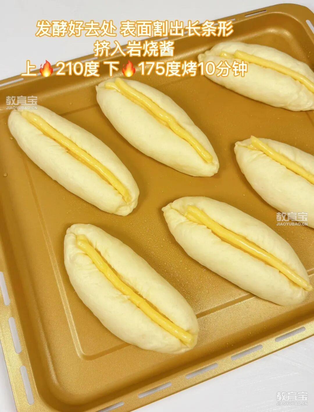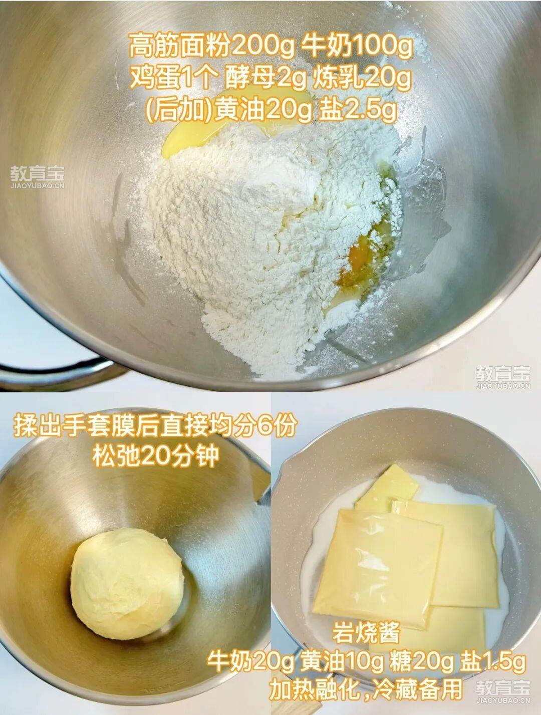 配料表一一●面包体:高筋粉200g、酵母2g冰牛奶100g、鸡蛋1颗炼乳20g、黄油20g、盐2.5g●岩烧酱:芝士片3片、黄油10g糖20g、牛奶20g、盐1.5g