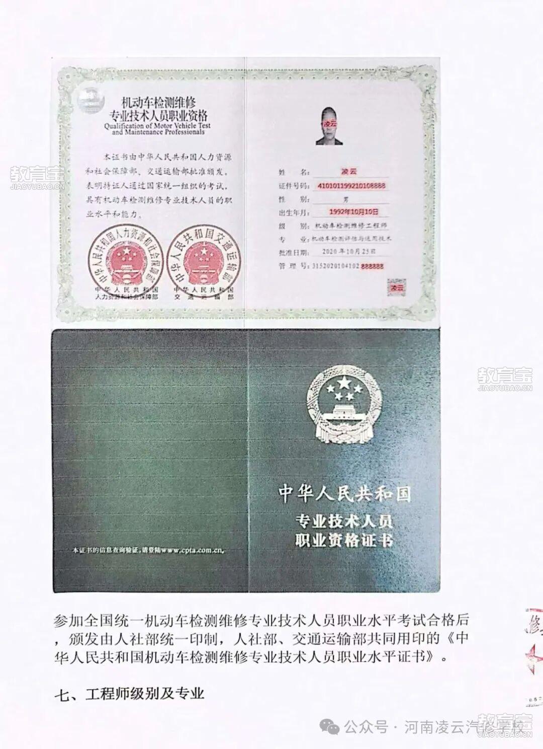 机动车检测维修专业技术人员职业水平评价制度是机动车检测维修领域唯以一项国家专业技术职业资格考试,是加强机动车检测维修人才队伍建设的重要举措。由人力资源和社会保障部、交通部双部委联合建立机动车检测维修专业技术人员资格考试制度,也是国家职业资格证书汽车行业的权威证书,得到企事业单位认可。一、培训对象汽车维修企业技术负责人,质量检验员,技术总监,售后主管,车间班组长;汽车检测站的主要负责人员、授权签字人、技术负责人、汽车制造企业、汽车改装厂及汽车鉴定,汽车评估单位主要负责人及检测维修相关专业技术人才等。二、培训内容机动车检测维修实务,机动车检测维修案例分析,机动车检测维修法律法规共计三门,理论与实践相结合,从基础知识,专业知识,重点知识讲解到多年考试真题,结合命题思路,理顺出题规律、强化辅导内容,提升考生过关*。三、报考条件机动车检测维修士的报名条件(符合下列条件之一)选项一:取得中等教育及以上学历或学位选项二:高等院校交通运输专业应届毕业生机动车检测维修工程师的报考条件(符合下列条件之一)选项一:符合基本条件且取得机动车检测维修士证书后,从事机动车检测维修工作满6年的可以报考机动车检测维修工程师。选项二:符合基础条件且满足以下条件之一后才可报考机动车检测维修工程师;1.交通运输专业大专学历从事机动车检测维修工作年限满5年;2.交通运输专业大学本科学历满4年;3.交通运输专业双学士学位或研究生毕业满2年;4.交通运输专业硕士学位满1年;5.交通运输专业博士学位无工作年限要求。选项三:1.其他工学类专业在交通专业学历或学位的基础上从事机动车检测维修工作年限相应增加2年;2.取得非工学类专业在交通专业学历或学位的从事机动车检测维修工作年限相应增加3年。四、*考条件条件一:1.2005年12月31日前,按照国家有关规定评聘为机动车检测维修专业助理工程师或工程师职务的人员,可免试本级别《机动车检测维修实务》科目;2.取得机动车维修技术负责人从业资格证书,并符合机动车检测维修工程师的报名条件的,可免试《机动车检测维修法规与技术》、《机动车检测维修实务》科目。3.取得质量检验员、机修、电器维修、钣金、涂漆或车辆技术评估(含检测)从业资格证书,并符合机动车检测维修士的报名条件的,参加对应专业的考试,可免试《机动车检测维修实务》科目五、培训安排2025年3月10日--6月14日(报名赠送内部教材)每周*少二节直播教学,(共直播培训200课时)六、证书样本参加全国统一机动车检测维修专业技术人员职业水平考试合格后,颁发由人社部统一印制,人社部、交通运输部共同用印的《中华人民共和国机动车检测维修专业技术人员职业水平证书》。七、工程师级别及专业目前分机动车检测维修士和机动车检测维修工程师两个级别。分机动车机电维修技术(汽车维修行业)、机动车整形技术(汽车钣喷行业)、机动车检测维修与运用技术(汽车检测行业)三个专业。八、师资团队我校聘请行业知名专家进行主讲,采用理论与实践相互结合学习的模式,利用网上直播培训,手机模拟题库,维修实务场家授权,考前冲刺等方式学习,虽然我们帮助很多学员已经顺利取得机动车检测维修工程师证书,取得了良好的社会效益,但是我们依然专业,专注,专心的真题讲解,案例分析,考点总结,考面覆盖,答题技巧,模拟试卷等为您顺利过关保驾护航。九、资料提交1.身份证正反面,2.学历和学位复印件,3.三张二寸白底照片和电子版照片(295×413像素一下,jpg格式小于10KB)4.从事机动车检测维修工作年限证明 ,十、培训费用机动车检测维修士培训费用3200元(一年)(免费刷题库)机动车检测维修工程师培训费用4800(一年),(免费刷题库),第一年考不过的科目第二年需要培训的补交一科1000元。缴费账户:河南凌云汽修职业培训学校开户银行:郑州银行二里岗支行对公账户:995330120109015050十一、联系我们徐老师手机/微信:15938700037报名地址:郑州市中原区郑上路136号锦艺汽车智汇港学校官网:www.qixiu123.com办公电话:0371-66345541免费电话:4006670087