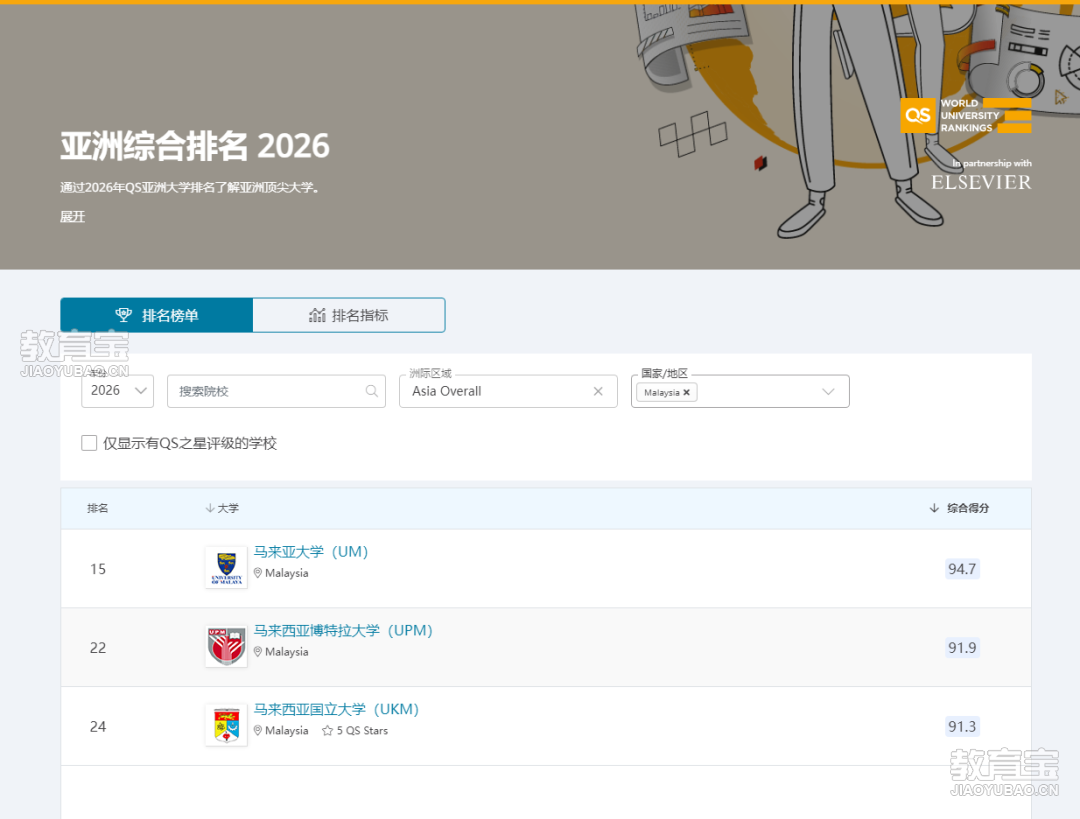 点击关注,获取更多资讯全球高等教育分析机构QS Quacquarelli Symonds(QS)于2025年11月4日正式发布了2026QS亚洲大学排名。马来西亚高校表现如何?哪所大学领跑?哪些学校进步最大?一起来看详细解读!马来5所大学跻身亚洲前50马来西亚共有49...