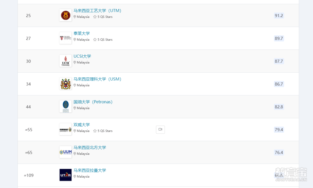 3私立院校表现抢眼:私立大学的排名也有显著提升。双威大学是本次排名中最大的黑马之一,排名大幅上升了129位。此外,国油科技大学(UTP) 在私立院校中排名第*。