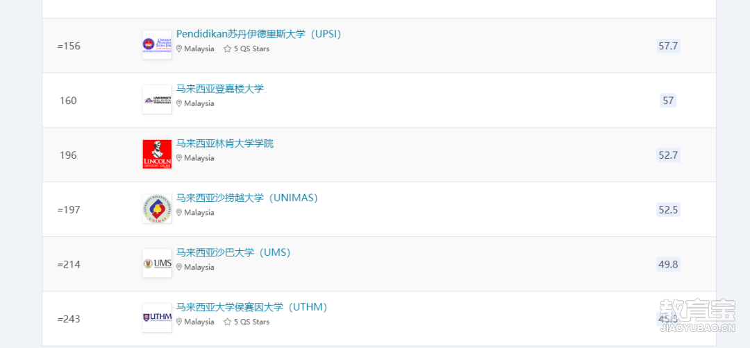马来5所大学跻身亚洲前50马来西亚共有49所大学上榜,其中30所大学排名上升,10所略有下降,另有9所为新上榜院校。? 马来亚大学(UM):亚洲第15名(浙江大学排名14)? 马来西亚博特拉大学(UPM):亚洲第22名(中国科学技术大学排名21)? 马来西亚国民大学(UKM):亚洲第24名? 马来西亚理工大学(UTM):亚洲第25名? 马来西亚理科大学(USM):亚洲第34名(武汉大学排名31)1学府稳居前列马来亚大学(UM) 作为马来西亚的学府,位居世界第58位,连续多年蝉联马来西亚榜首。在 QS11 项评估指标中,它有 3 项冲进亚洲前十:学术声誉亚洲第 14 位、雇主声誉亚洲第 10 位、国际研究网络亚洲第 4 位,足见其在学术界与就业市场的双重认可度!