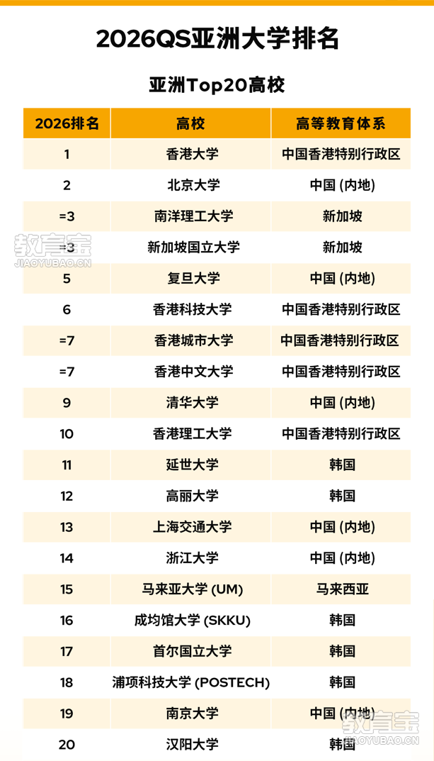 国际高等教育研究机构QS于11月4日(昨天)正式发布了2026QS亚洲大学排名。其中,香港大学超越“清北”荣登亚洲榜首,北京大学位居第二,新加坡两所高校南阳理工大学和新加坡国立大学并列位居第三。这一届榜单从规模上讲创下历史之最,涵盖了25个高等教育体系,1529所院校...
