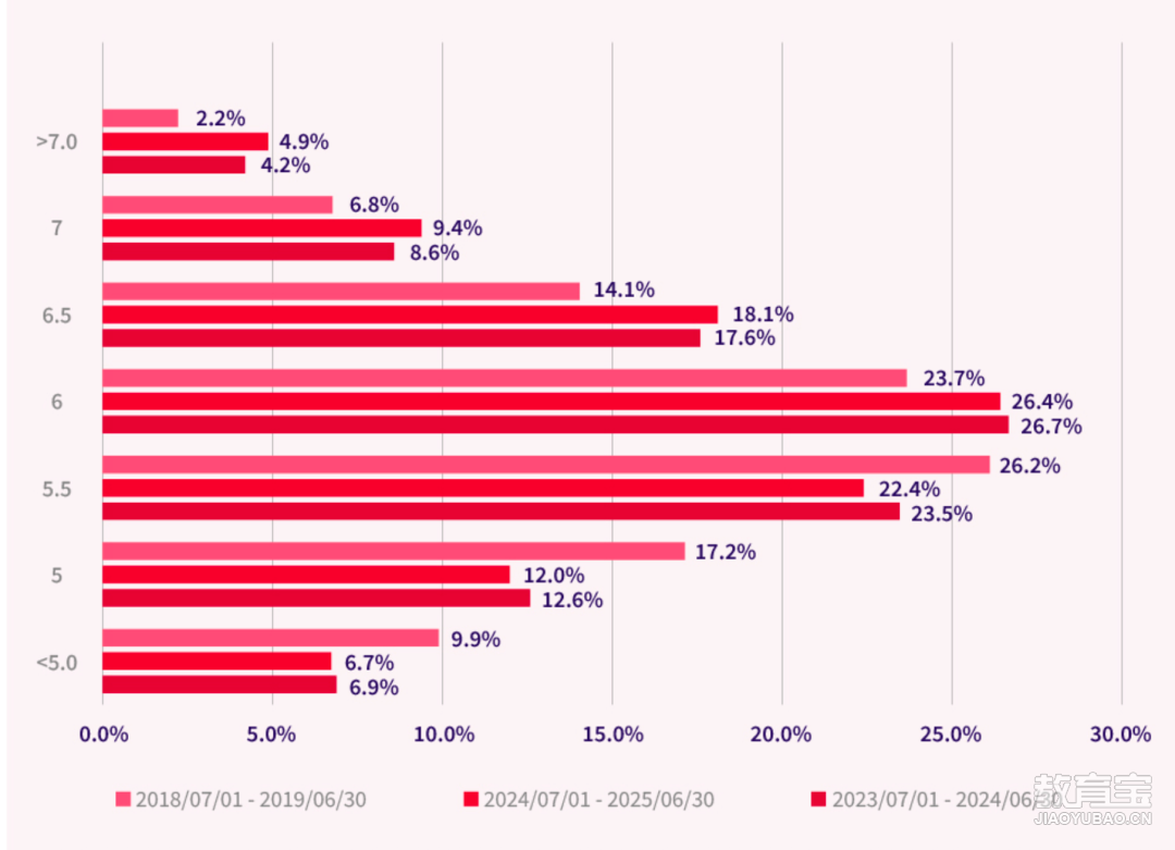 中国大陆地区学术类雅思考生均分*表现2024-2025年雅思考生总分集中在5.5分、6.0分和6.5分三个梯队,6.0分及以上梯队考生接近六成,相比去年的情况来看,7.0分以上的学生有所减少,5.5分以下的考生比例上涨。