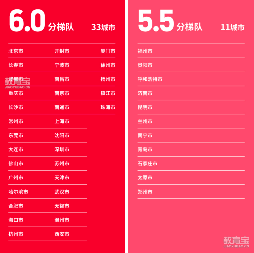 中国大陆地区学术类雅思均分区域表现(总分)44个雅思考点城市的学术类*分布来看,33座城市总分进入6分梯队,11座城市处于5.5分梯队。