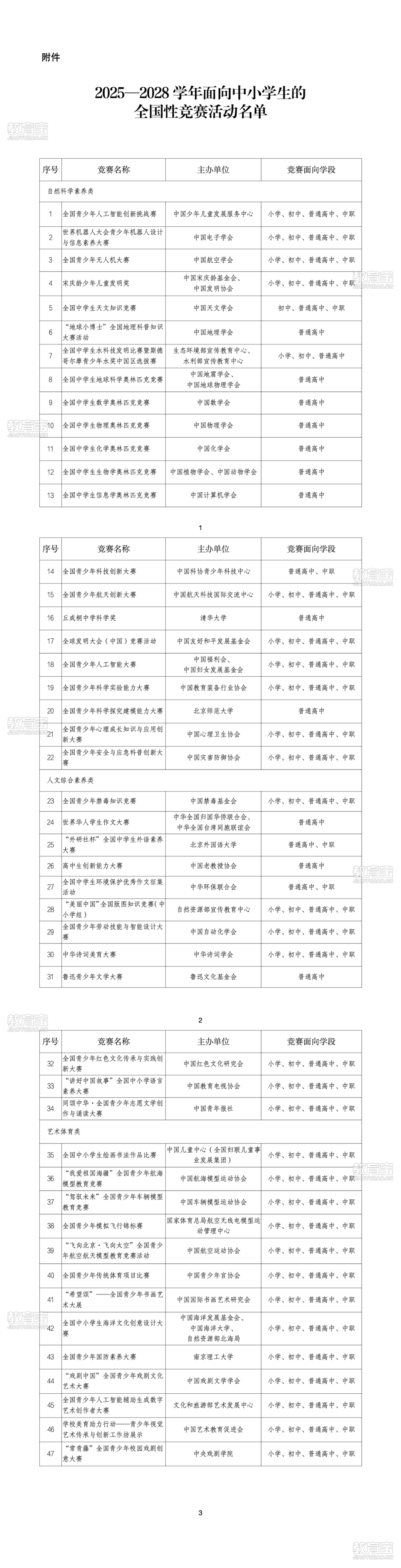 来源教育部官网近日,教育部办公厅公示2025—2028学年面向中小学生的全国性竞赛活动名单(以下简称白名单赛事),拟确定47项赛事入围。其中,自然科学素养类赛事共22项,占比近半数,全国青少年人工智能创新挑战赛、全国青少年科技创新大赛等科创类赛事在名单中再次占据主流。可以看出,此次名单调整延续了近年来我国青少年教育的相关导向,进一步体现国家对青少年创新能力培养的战略重视。通过对比2022年与2025年两轮 “白名单” 可见,科创类赛事呈现领域细化的趋势:2022年 “白名单” 中自然科学素养类赛事共23项(含后续停办),2025年调整至22项,新增赛事主要聚焦人工智能应用、跨学科科技创新、绿色低碳发明等领域。这一变化源于国家应对全球科技竞争、培育拔尖创新人才的需求。当前,芯片、人工智能、生物医药等关键领域的发展,亟需从青少年阶段培养具备创新思维与实践能力的储备人才,而科创类赛事正是实现这一目标的重要途径。与类赛事侧重知识掌握、体育艺术类赛事侧重技能熟练度不同,科创类赛事重点考核学生的综合能力。从项目选题的创新角度,到方案落地过程中的动手能力,再到团队协作中的沟通与配合程度,各环节均围绕青少年应对复杂问题的核心素养展开培养。这与素质教育倡导的 “全面性” 目标高度契合,也是科创类赛事区别于其他类别赛事的重要特征。值得一提的是,白名单赛事通常是经过教育部多轮筛选,从规则制定、评审标准到组织实施,均建立了成熟的全方位评估体系。相较于未入围 “白名单” 的赛事,其认可度更高,学校、社会及考学环节均将其作为重要参考。在科创赛事中这种认可程度更加明显。在当前中小学综合素质评价档案建设中,“白名单” 科创赛事获奖证明是重要材料:小升初阶段,部分地区将其作为优先录取的参考因素;中考阶段,多地特长生政策明确,科创赛事省级以上奖项可作为学生获得加分或破格入围的相关资格;高考阶段,在强基计划、综合评价等特殊招生通道中,科创赛事奖项能显著提升学生竞争力。