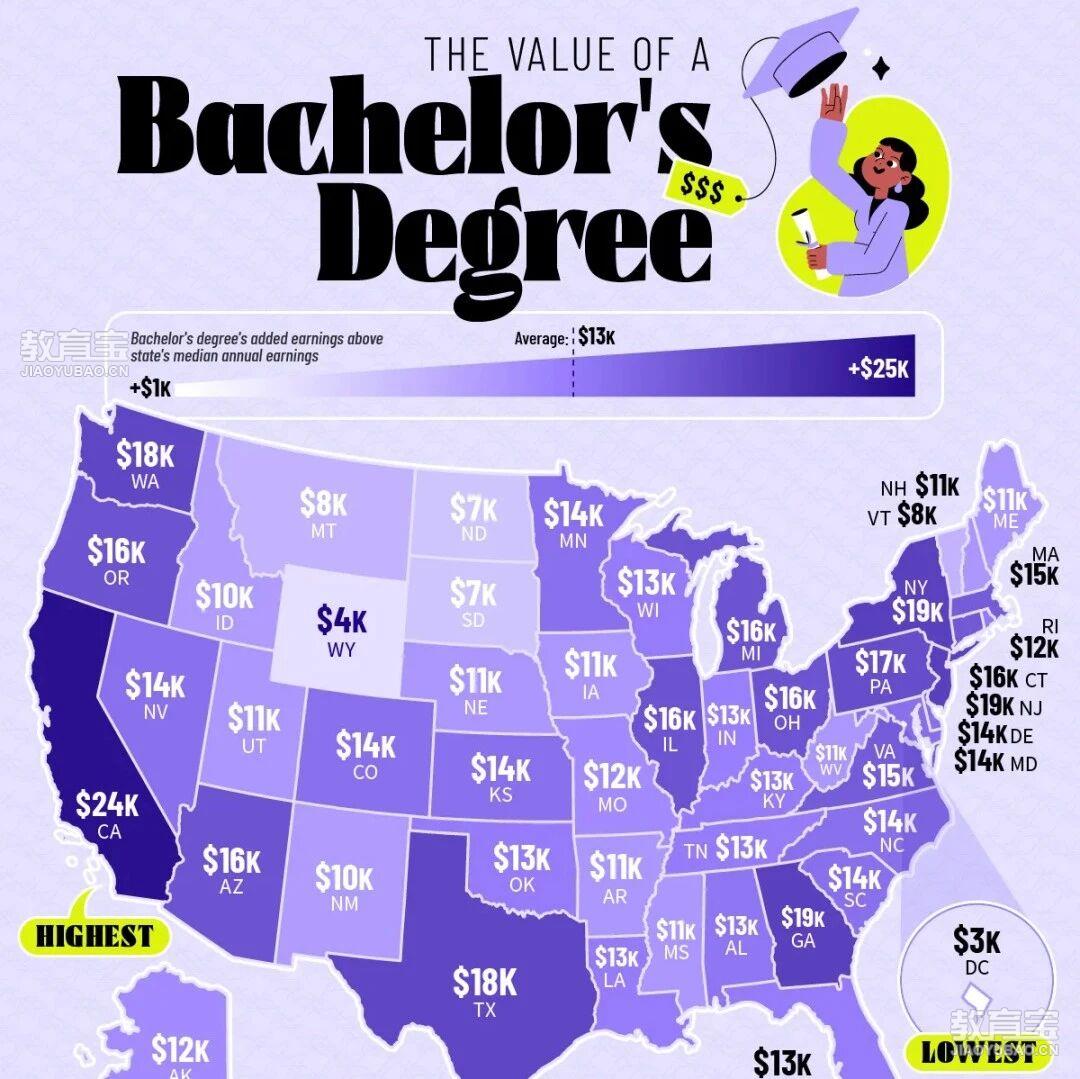 2025/11/20 0:02:29美国数据可视化媒体Visual Capitalist最近出了份《美国各州学士学位价值》报告——用2024年美国人口普查局的数据,比了比每个州里,有本科学位的人和州居民年收入中位数的差距,直接点出高等教育在不同地方的“回报率”差得有多远。全国平均下来,本科学历能让年收入比...