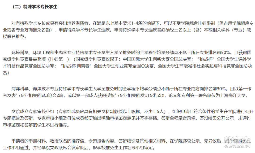 对于在特定专业领域有特殊学术专长或突出培养潜质的学生,在满足基本政治、品德和健康要求的前提下,可不受综合排名限制申请推免,但必须获得至少三位本校相关教授的联名推荐。申请者需满足其所在专业(如环境类、海洋类)设定的极高学术成果标准(如高等级竞赛最高奖、发表高水平论文或获得专利),并经过学院专家组的严格审核、公开答辩及多重公示程序,最终由学校审定。